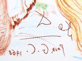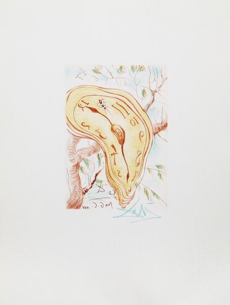Salvador Dali's iconic motif of a melting pocket watch first introduced in his painting, "The Persistence of Memory", is just as powerful and culturally significant as when he first created it. Representing the relativity of space and time, this work is one of many that the artist uséd to convey his own thoughts about life and dreams. This print was published by the Collector's Guild in 1968 and includes a dedication in the plate of "Pour CG 1968" as well as a facsimile signature.