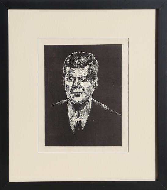 A portrait of John F. Kennedy by American artist, Bob Forman. The woodcut print is signed and dated 1963 in the plate. Nicely framed.