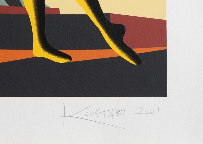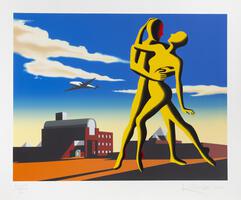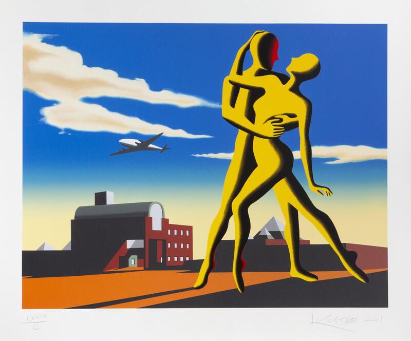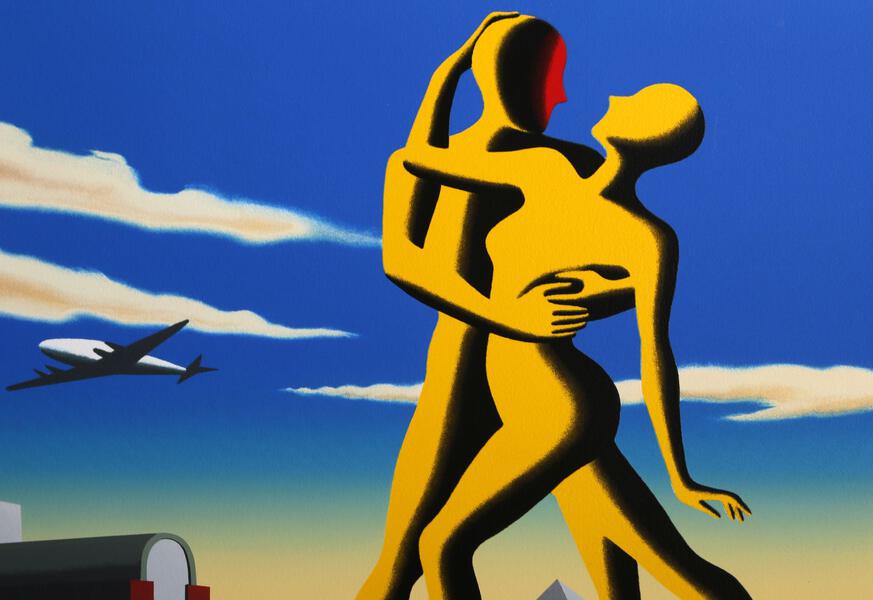 A couple stands embracing before an airplane taking off from an airport by Mark Kostabi. A print the captures the feelings of love and beauty.