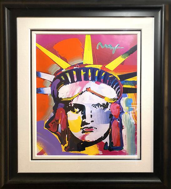 A bright and stunning portrait of lady liberty by psychedelic pop artist Peter Max. From 1999 this painting is a mixed media work with acrylic over a lithograph. Framed as shown.