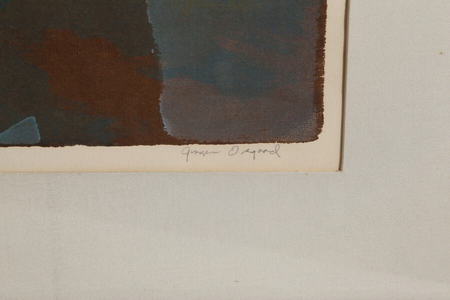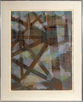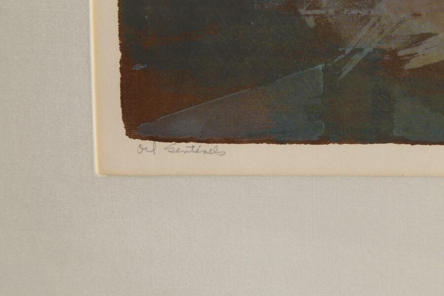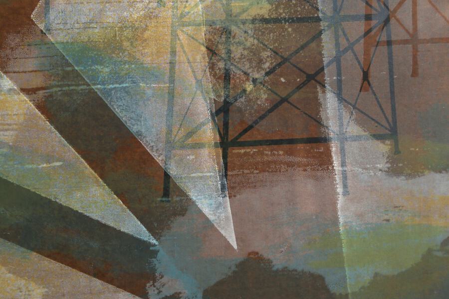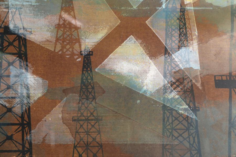 In this abstract print by American artist Ginger Osgood, oil towers are abstracted and duplicated. She titled this print "Oil Sentinels", sentinel being the word for a guard, or a soldier who must stand watch. Perhaps this a nod to the oil towers themselves, which are left to oversee the oil wells.