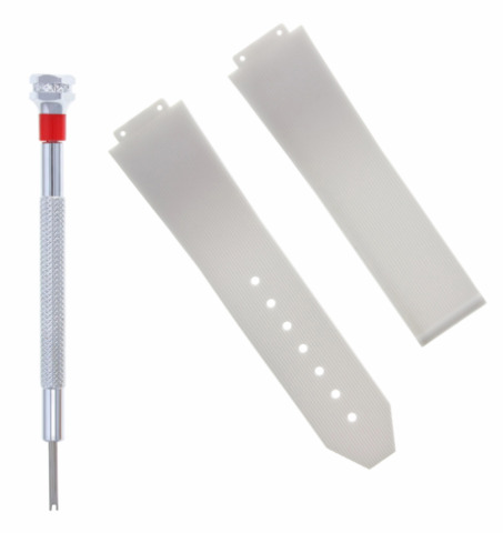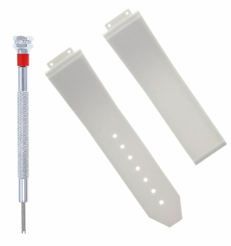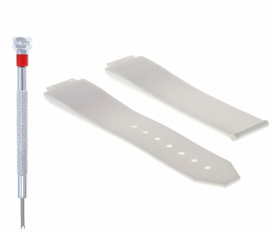 The item for sale is a brand new, aftermarket replacement white, soft rubber, diver strap in white color and screwdriver.