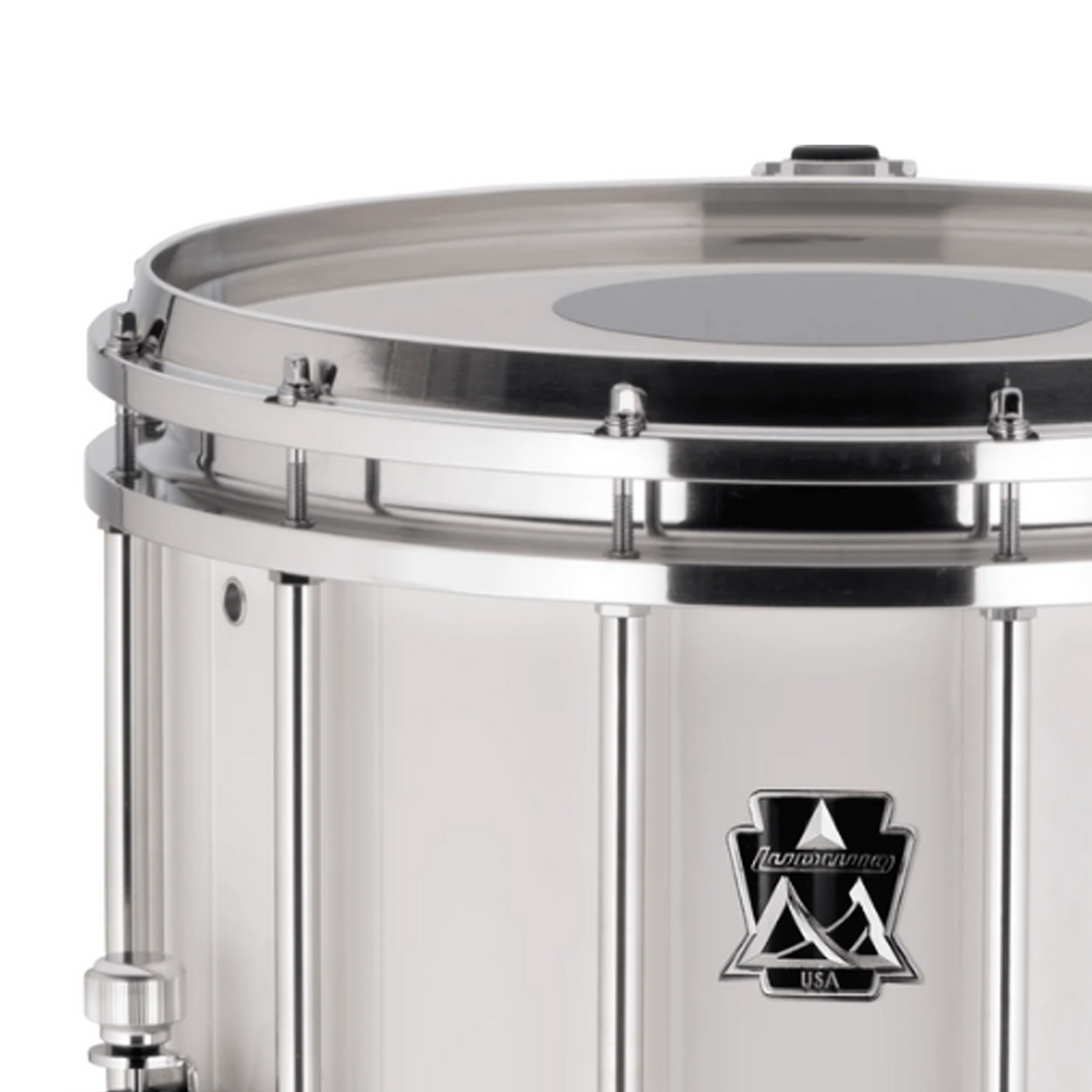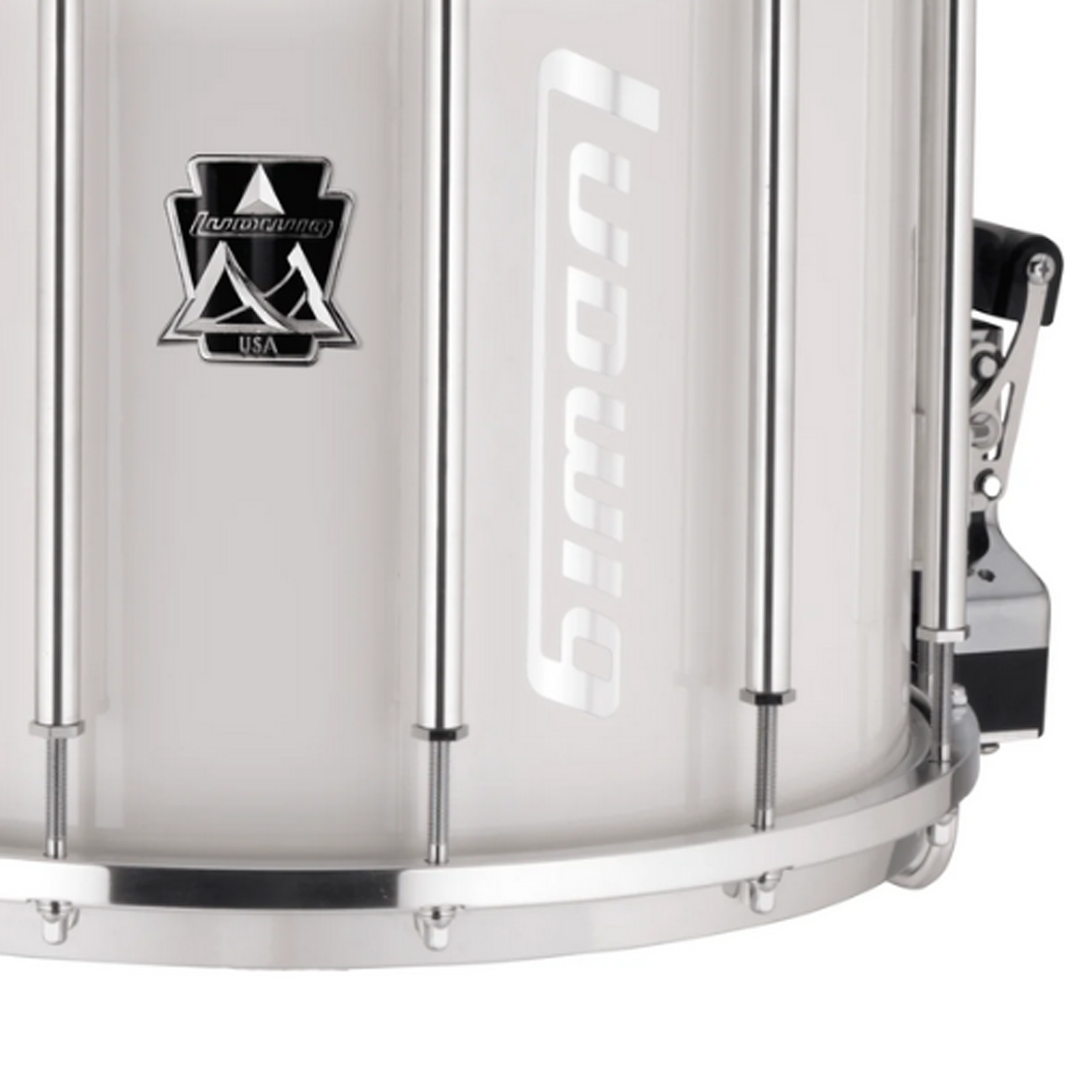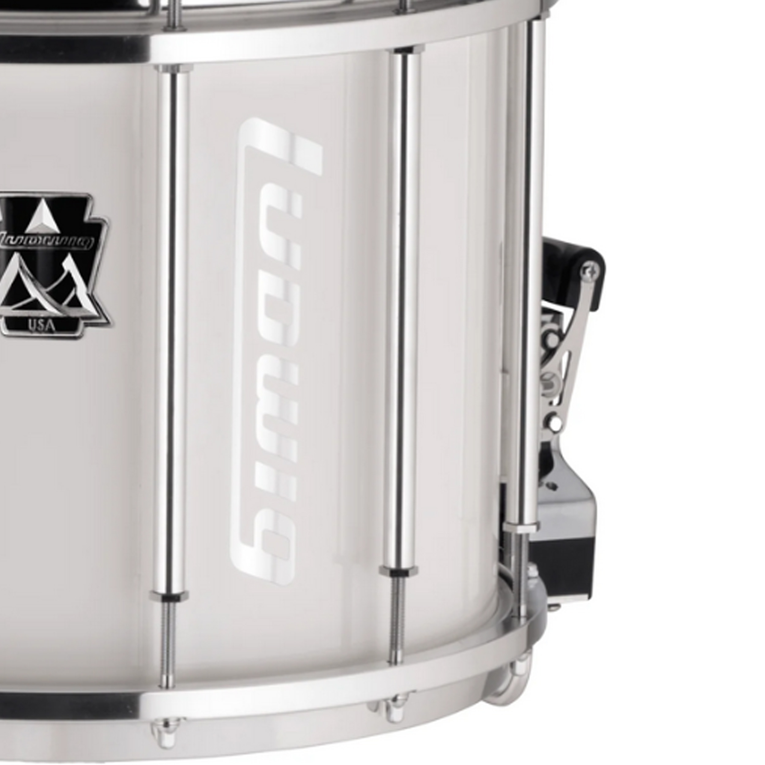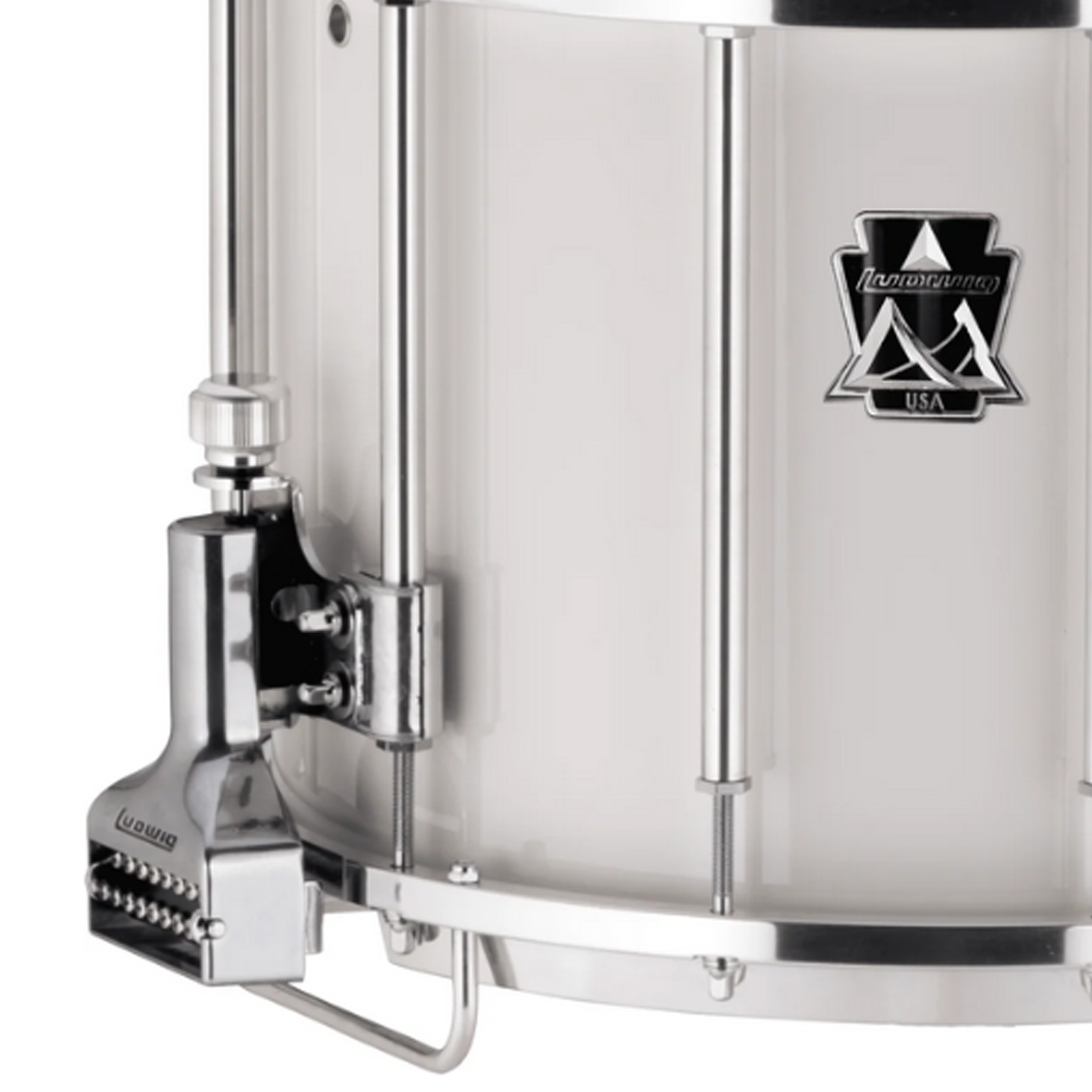 The Ludwig Ultimate snare drum takes the existing Free-Floater model to a whole new level. Designed to meet today's marching demands, the Ultimate snare drum allows the player to achieve clean and crisp articulations with minimal weight. The secret is in the lightweight aluminum hardware that secures the heads, allowing the thick 8-ply Maple shell to be completely suspended for exceptional projection and resonance.