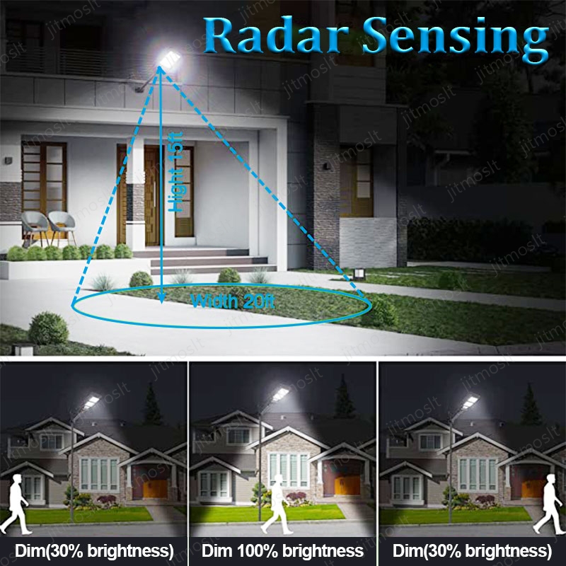 8.light on when sensing motion, dim light when no motion.When a pedestrian into the induction area:100% bringtness and it will delay 30s.No pedestrian at night:30% brightness.