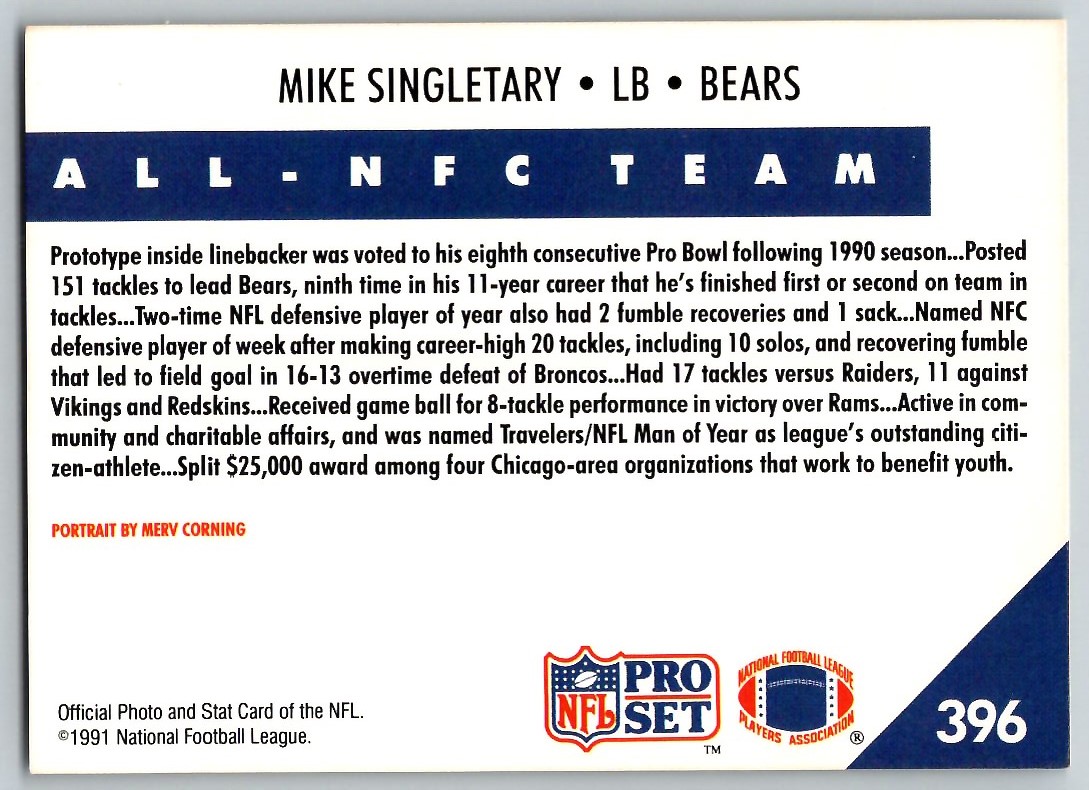 | 1991 PRO SET MIKE SINGLETARY CHICAGO BEARS #396 |