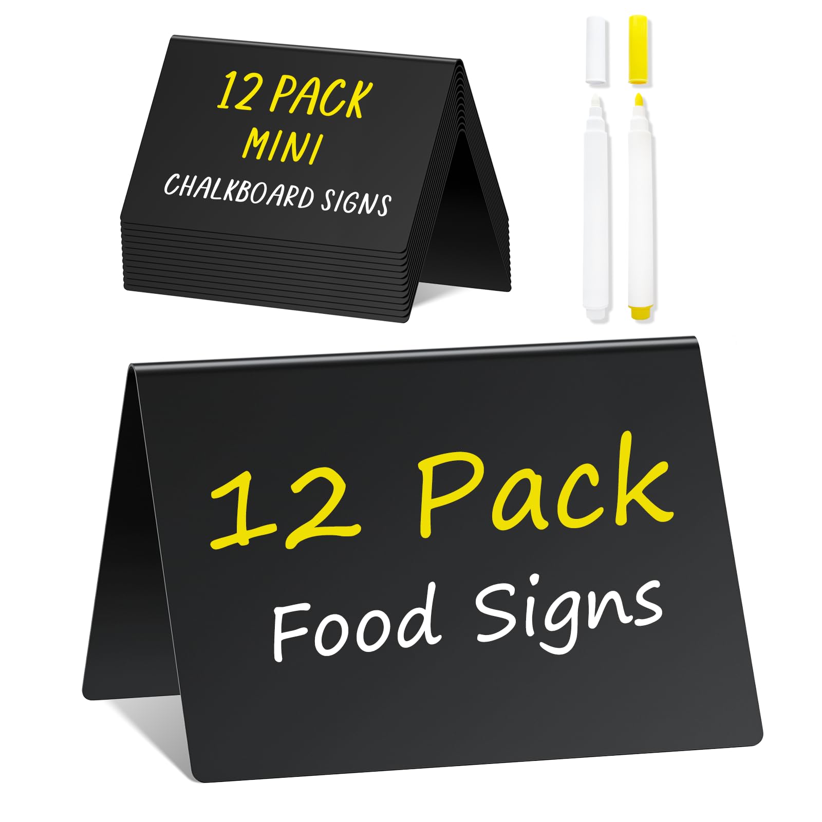 - 12x Small Plastic Chalk Board Signs+2x Vibrant Liquid Chalk Markers: Each Sign measures 4''x3'', along with 2 vibrant-colored liquid chalk markers, yellow and white