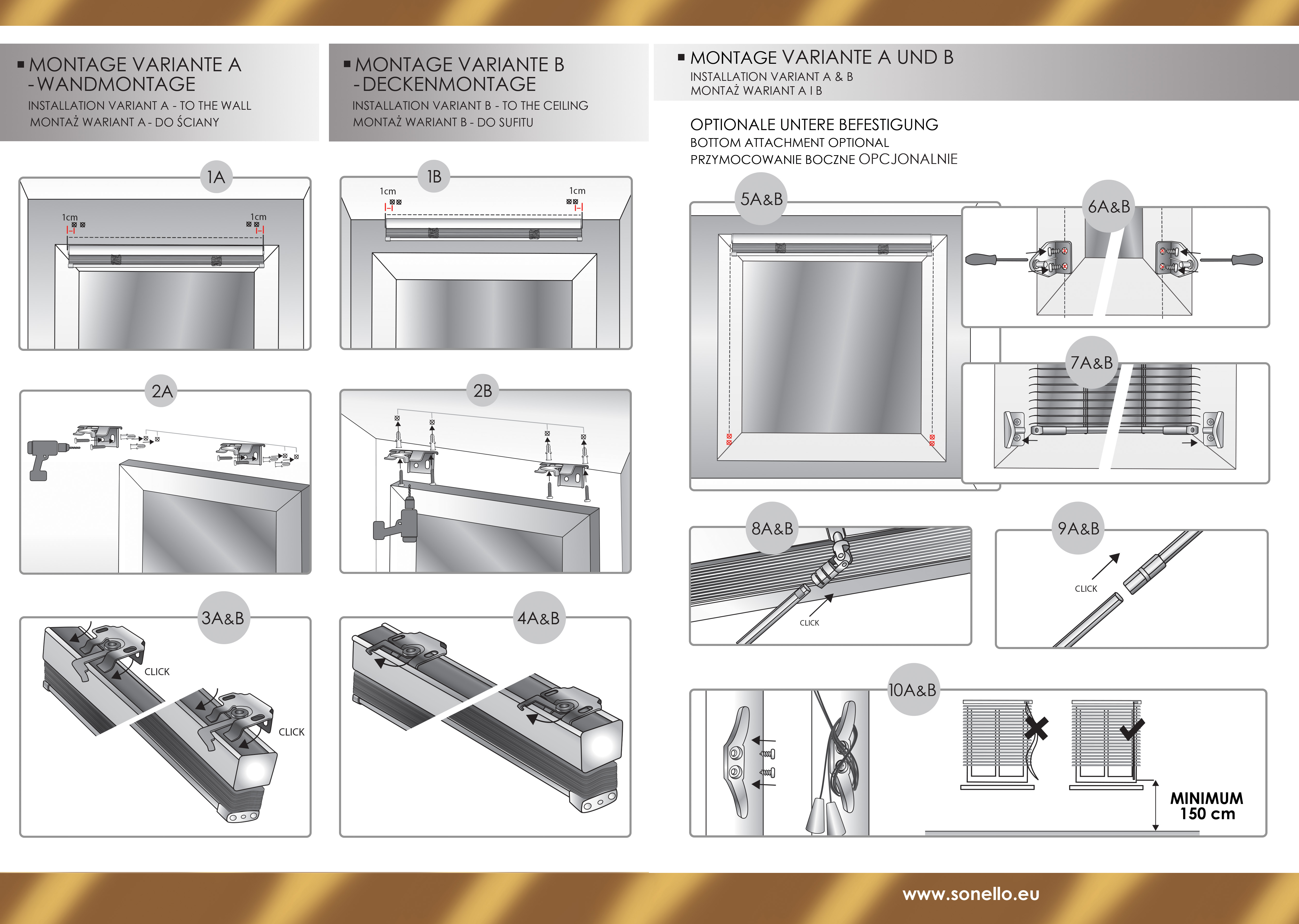 Bei Bedarf ist auch die sonst übliche Wand- als auch Deckenmontage mit Bohren möglich und kann in wenigen Schritten und Minuten durchgeführt werden. Die Anbringung der Jalousie mittels Bohren ist auch in der Montageanleitung detailliert dargestellt. Die Montageanleitung finden Sie auch weiter auf der Artikelseite.