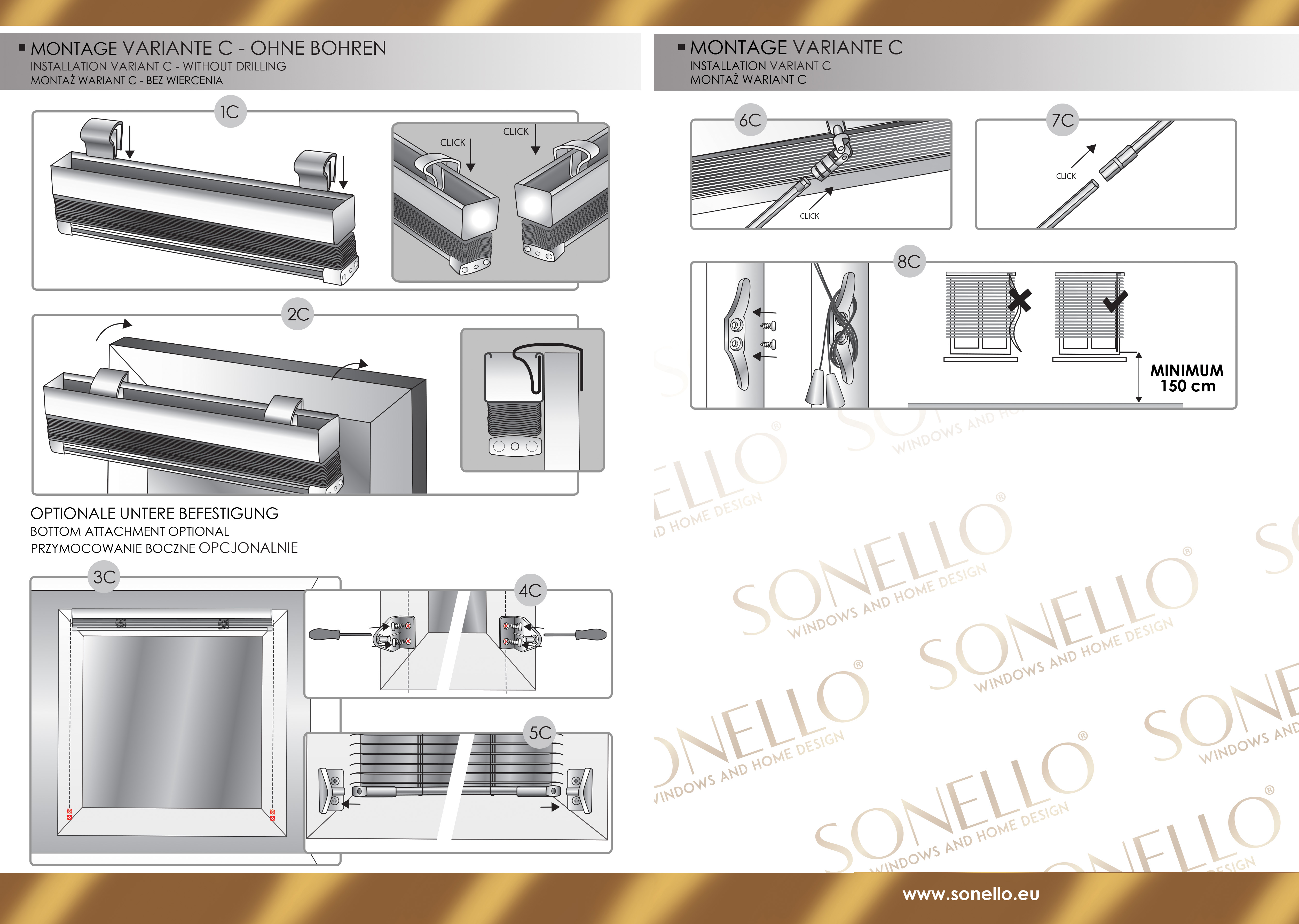 Um Ihren Komfort zu maximieren, bietet die Jalousie die optionale Möglichkeit einer zusätzlichen Befestigung am unteren Teil des Fensters bei jeder Montageart. Diese Funktion verhindert effektiv unerwünschte Bewegungen der Jalousie beim Kippen und Öffnen des Fensters und gewährleistet somit eine stabilere und zuverlässigere Nutzung.
