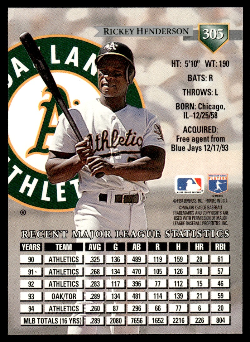 | Description: | Rickey Henderson | | Category: | Baseball | | Year: | 1995 | | Product: | Donruss | | Card Number: | 305 | | Dimensions: | 3½" x 2½" | | SKU: | BL B0001 R03 B (119) |