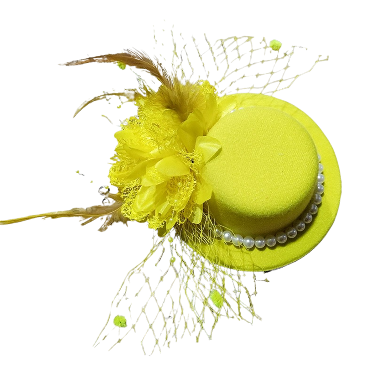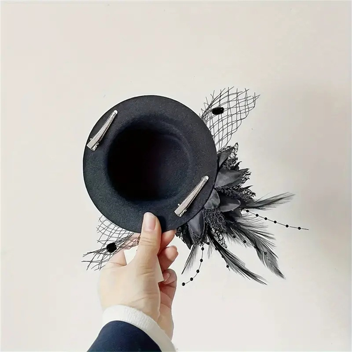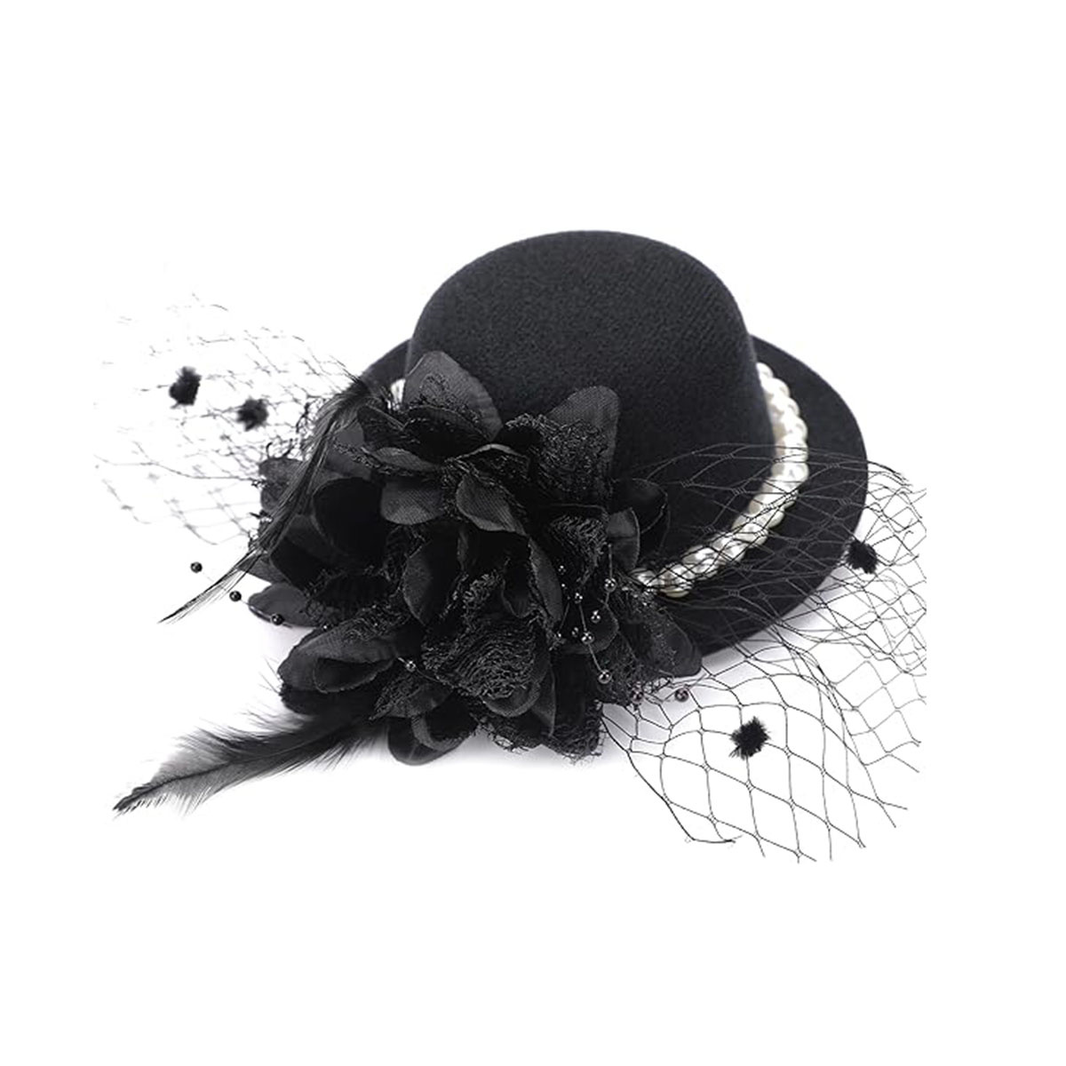 1.Black Mesh: This black tea party hat is made of fine mesh combined with selected pearls, with high-quality chicken feather bouquets, every detail