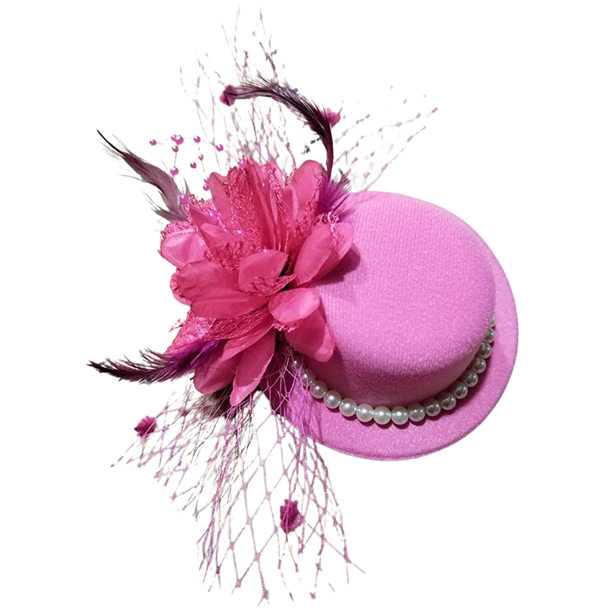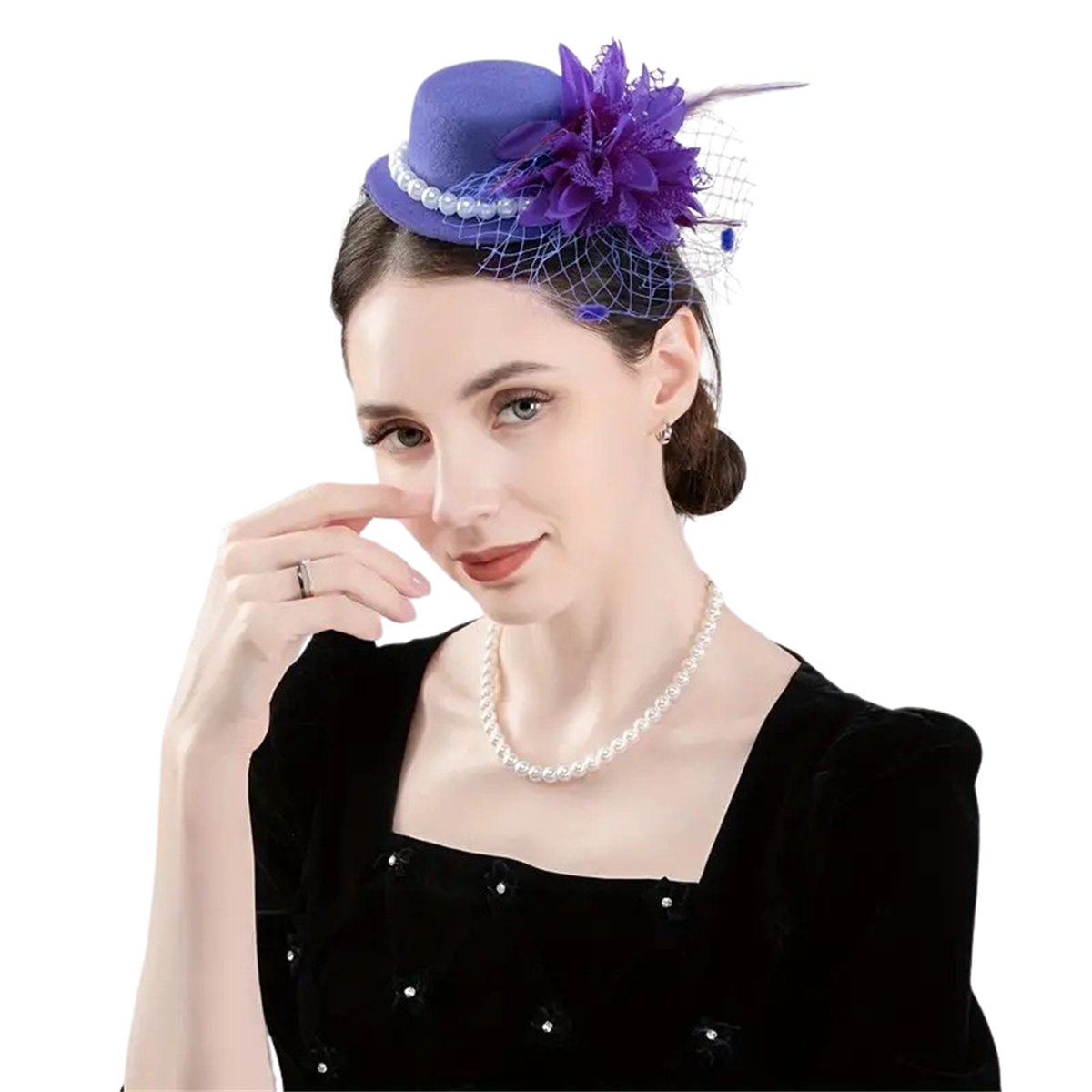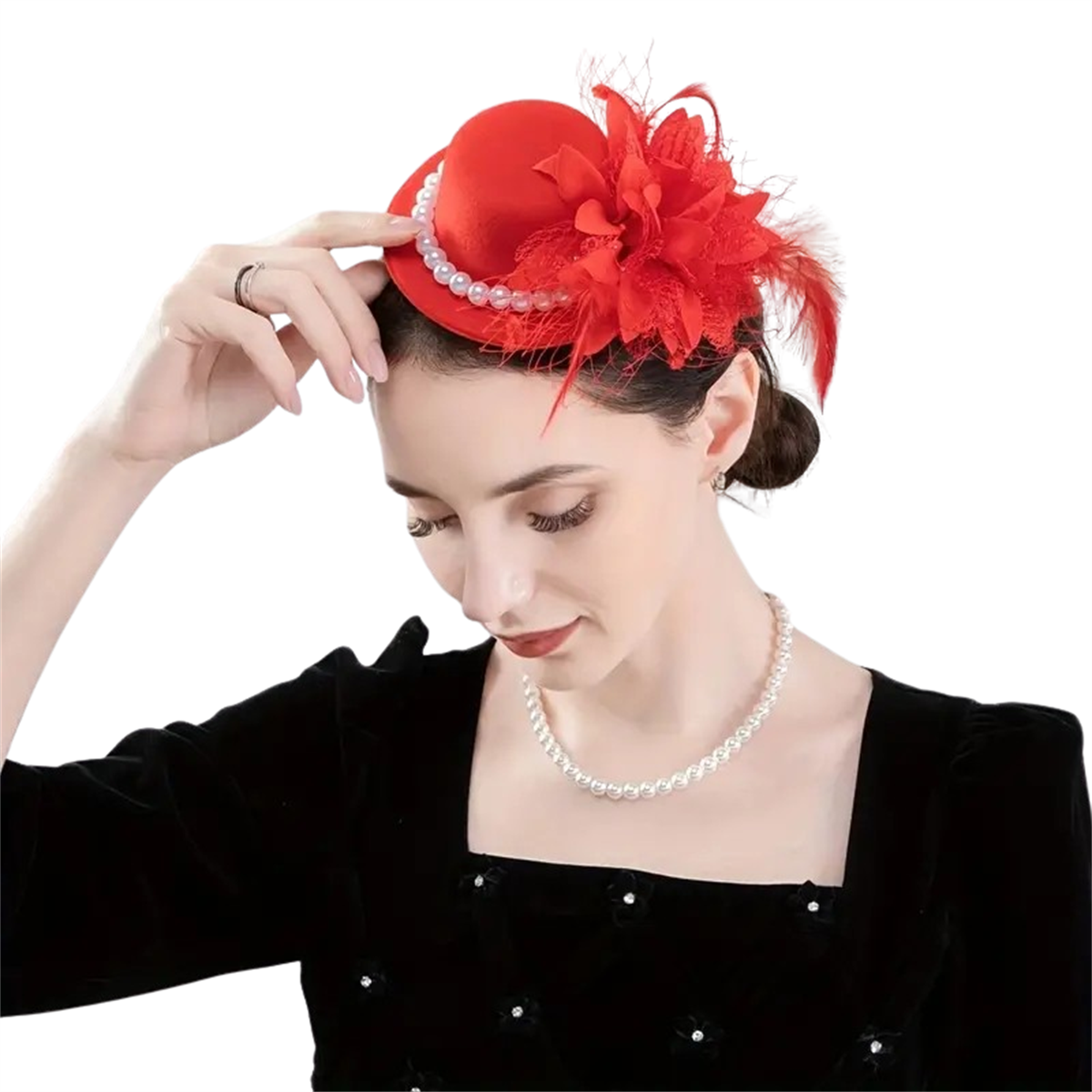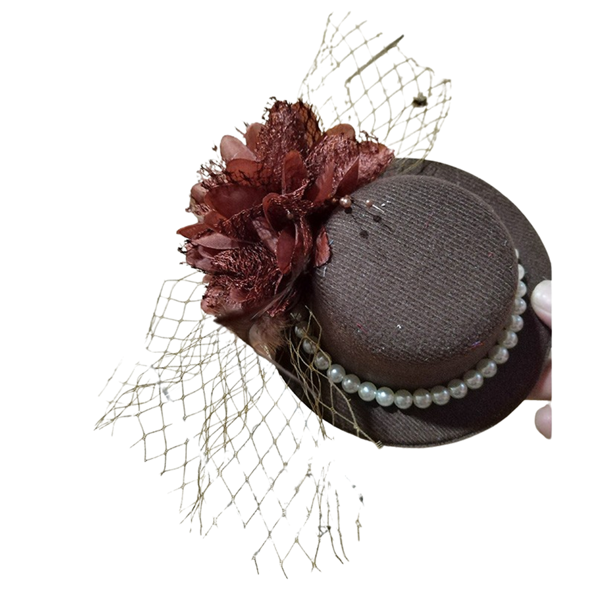 1.Black Mesh: This black tea party hat is made of fine mesh combined with selected pearls, with high-quality chicken feather bouquets, every detail