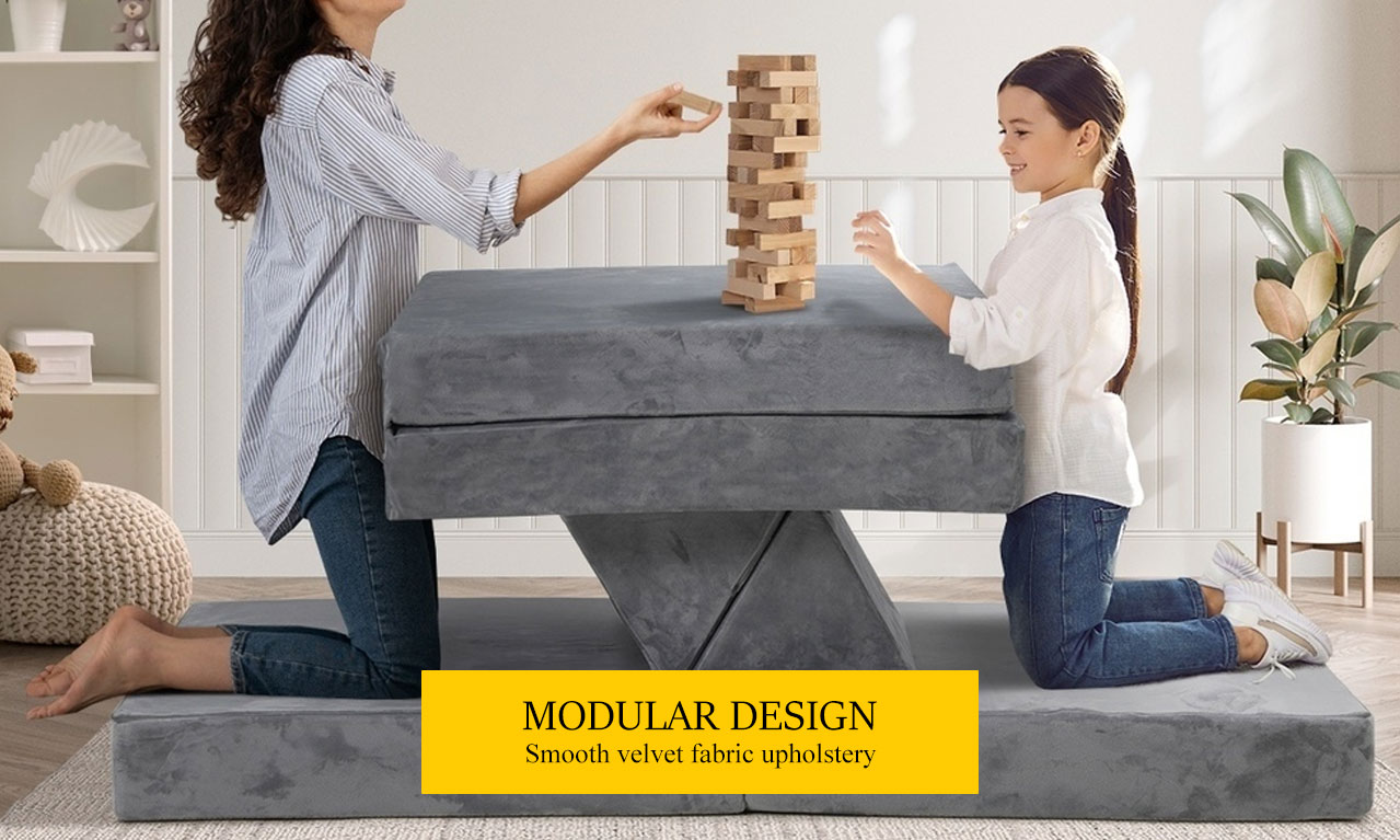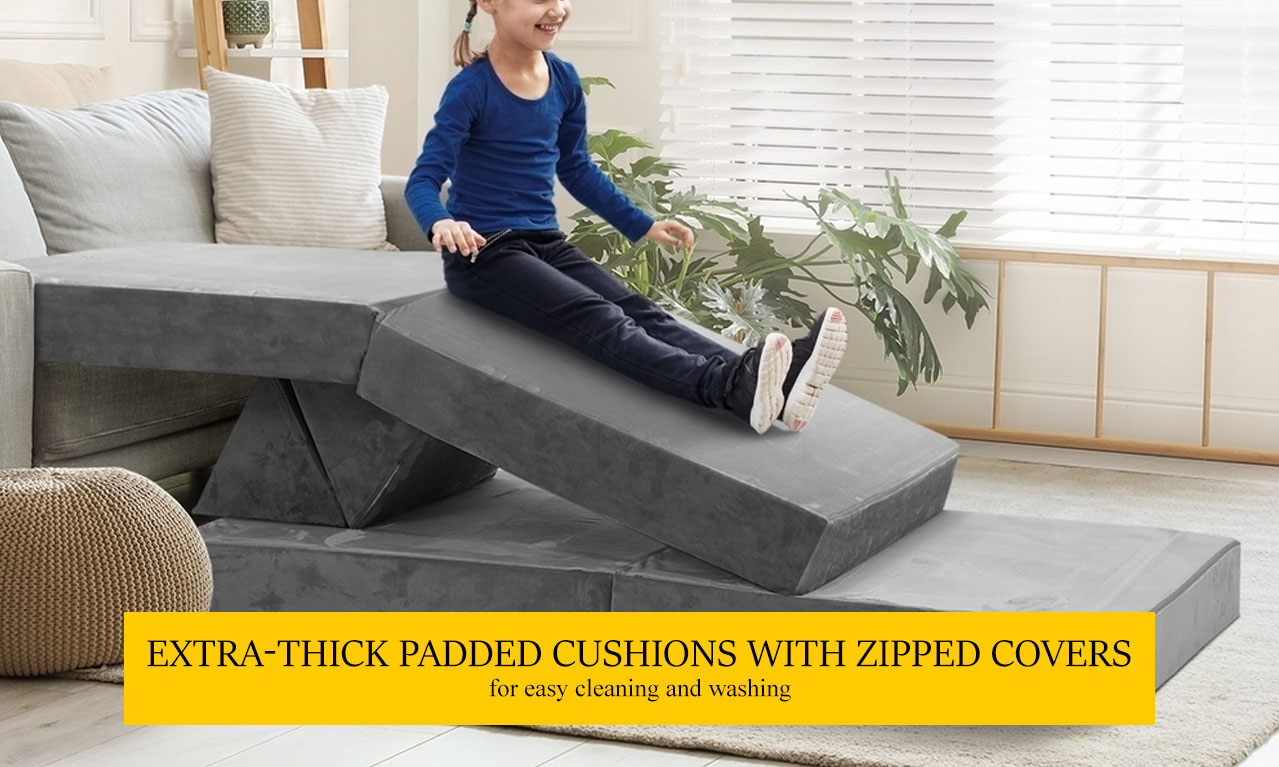 Upholstered in a comfortable velvet fabric, the couch also features extra-thick padded cushions with zipped covers for easy cleaning and washing. From the simple to the complex, the Oikiture Kids Play Couch is a geometrical wonder in more ways than one.