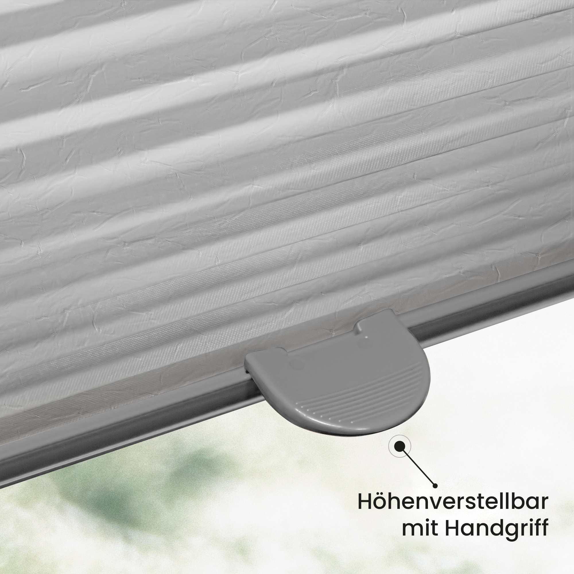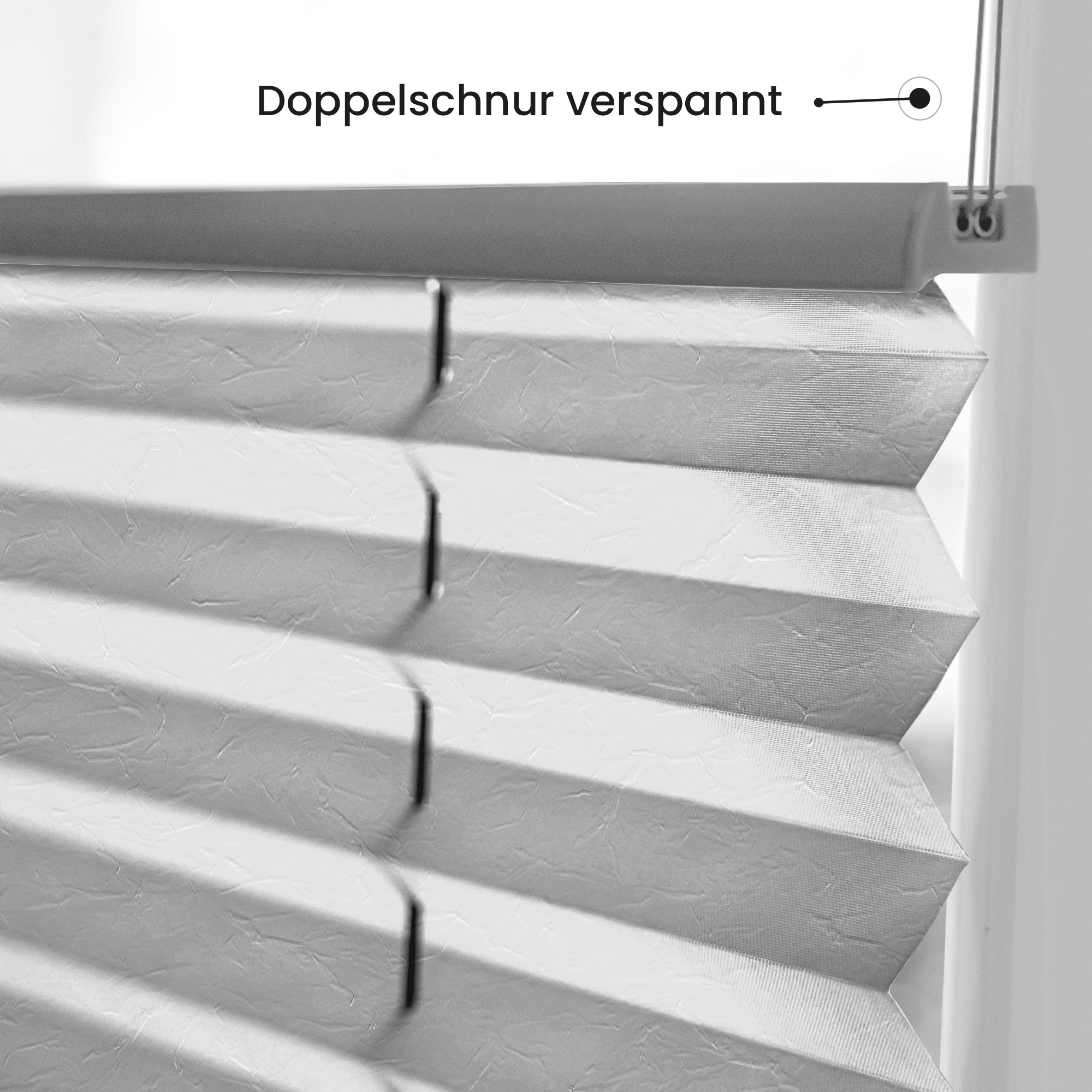 Das Plissee besteht aus einem hochwertigem, strapazierfähigen, blickdichten, UV-unempfindlichen und gefalteten Polyester-Plisseestoff, welcher sich beim Auf- und Zumachen wie eine Ziehharmonika auseinander- und zusammenzieht. Durch die Verspannungen unten sowie oben am Fenster pendelt das Plissee nicht und liegt am Fenster an, auch wenn dieses auf Kipp geöffnet ist.