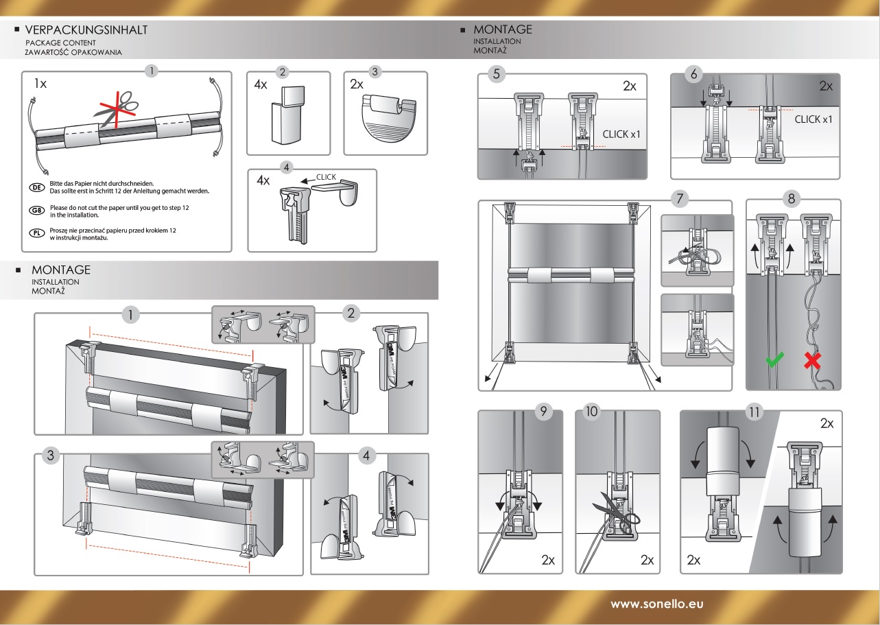 Die Anbringung des Plissees von SONELLO verläuft ebenso schnell wie kinderleicht. Nach nur wenigen Schritten, welche in der Anleitung detailliert dargestellt werden, und wenigen Minuten ist das Plissee von SONELLO an dem gewünschten Ort montiert und bietet auf Anhieb eine Erhöhung des Wohnwertes. Hierbei entfällt das lästige Bohren gänzlich, welches nicht nur unangenehm ist sondern auch die Fenster- bzw. Türrahmen beschädigt, was insbesondere in Mietwohnungen bei Auszug zu Ausgleichzahlungen führen könnte. Die SONELLO Plissees werden lediglich durch die mitgelieferten hochwertigen und stabilen Klemmhalterungen an dem Fenster- bzw. Türrahmen angebracht, welche sich auf die Dicke Ihres Fenster- bzw. Türrahmens individuell einstellen lassen. Die Klemmhalterungen sind für eine Rahmenbreite von maximal 2,5cm (ohne Dichtung) anbringbar. Unter 2,5cm Rahmenstärke lässt sich die Klemmhalterung individuell an dem Rahmen anpassen. Zusätzlich befinden sich an den Klemmhalterungen doppelseitige Klebepads. Das ermöglicht Ihnen nicht nur eine sehr stabile Anbringung, welche ohne Schäden an den Fenstern bzw. Türen durchgeführt wird (sehr wichtig insbesondere bei Mietwohnungen), sondern bietet Ihnen auch eine rückstandslose Entfernung des Rollos. Somit lässt sich das Plissee bei einem Umzug rückstandsfrei entfernen und in der neuen Wohnung wieder anbringen. Das Plissee nimmt bei der Demontierung keinen Schaden und kann im Anschluss wieder auf ein neues Fenster bzw. Tür angebracht werden. Somit ist das Plissee von SONELLO flexibel anwendbar. Die Montageanleitung finden Sie auch weiter unten auf der Artikelseite dargestellt.