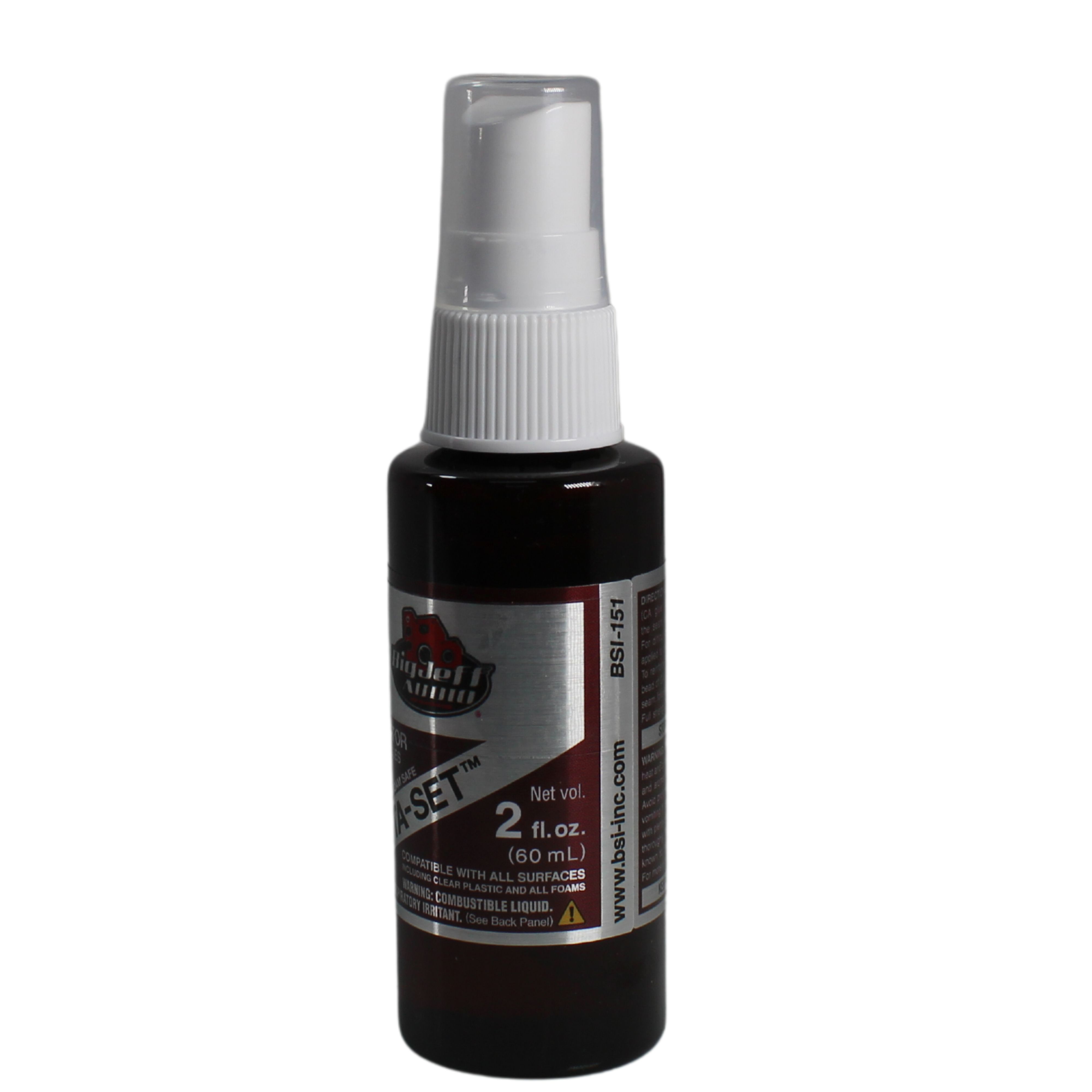 After joining parts with cyanoacrylate (CA, super glue), spray the seams with Insta-Set to cure the CA in 8 seconds. A bead of CA can then be applied to the outside and corners of joints before another application of Insta-Set to reinforce their strength. Insta-Set can also be applied to one part (with CA on the other) before joining for difficult to bond materials. Insta-Set is compatible with all surfaces, including clear plastic and all foams. It also is a great cleaning agent for adhesive residue and scuff marks. Store separately from CAs.