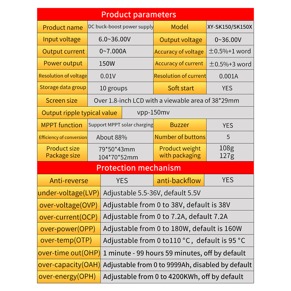 Over-temperature protection: 0-110°C adjustable, default 95°C