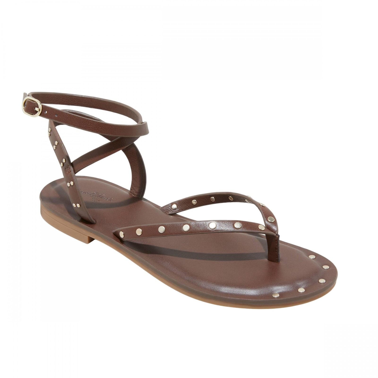 Give a fashion-forward look to your footwear collection with these Nikki Studded Thong Sandals from Universal Thread. These brown thong sandals are detailed with metallic stud accents on the straps for edgy style. Universal Thread studded thong sandals Open toe and back Heel strap with buckle Textured outsole Brown color Sizing: Womens Construction: Ankle Strap Footwear Insole Material: 100% Polyurethane Features: Buckle Care and Cleaning: Clean With Mild Detergent Footwear Lining Material: 100% Polyurethane Toe Style: Round Toe Footwear Upper Material: 100% Polyurethane Heel: No Heel Footwear Outsole Material: 100% TPR (Thermoplastic Rubber) Shoe Width: Medium Footwear toe openness: Open Toe Footwear outsole details: Textured Outsole