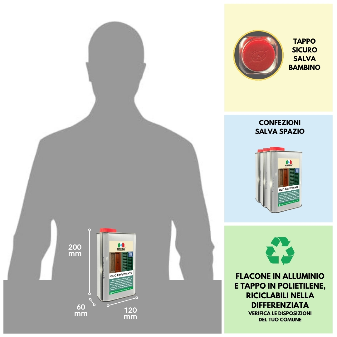 In particolare, OLIO RAVVIVANTE è specifico per trattare e rigenerare superfici in legno verniciato o oliato. È indicato anche per alluminio verniciato e ferro battuto. La sua formula oleo-cerosa idro-oleorepellente penetra in profondità. Così facendo, nutre il materiale e ne ripristina l’aspetto originale. Inoltre, non crea pellicole superficiali. Di fatto, il trattamento non sfoglia, non si screpola e non crea spellicolamenti nel tempo.