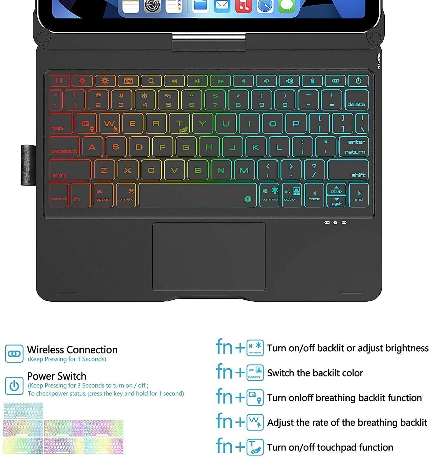 7 Colors Backlight Wireless Bluetooth KeyboardThis iPad tablet keyboard case have 7 customization light colors options, 3 level brightness control to fully match your mood, and provides a consistent and confident typing experience in low light to no light conditions. Plentiful fantastic colors, give you the freedom to choose which one you like offering pleased usage experience, adding typing joy.