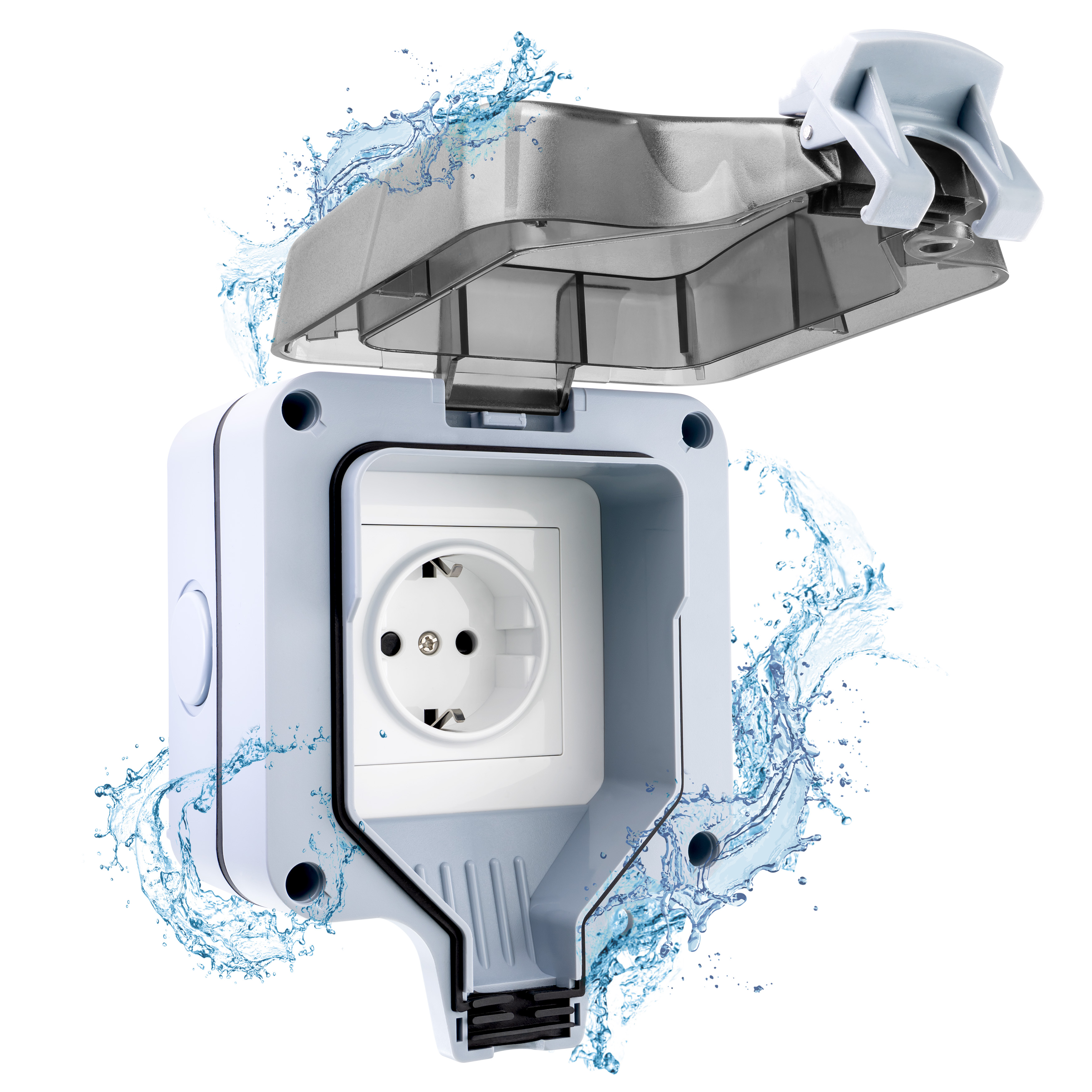 Unsere staubdichte wasserdichte Schutzkontaktsteckdose für den Außenbereich oder Feuchtraum innen, z B. Garten, Schwimmbad, Garage, Parkplatz, Badezimmer, Waschküche, Keller und Baustelle, Außenbeleuchtung und kommerzielle Anwendungen.