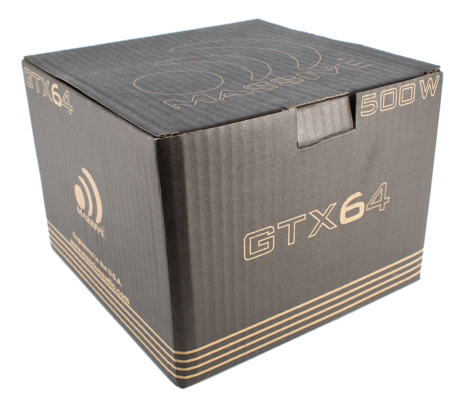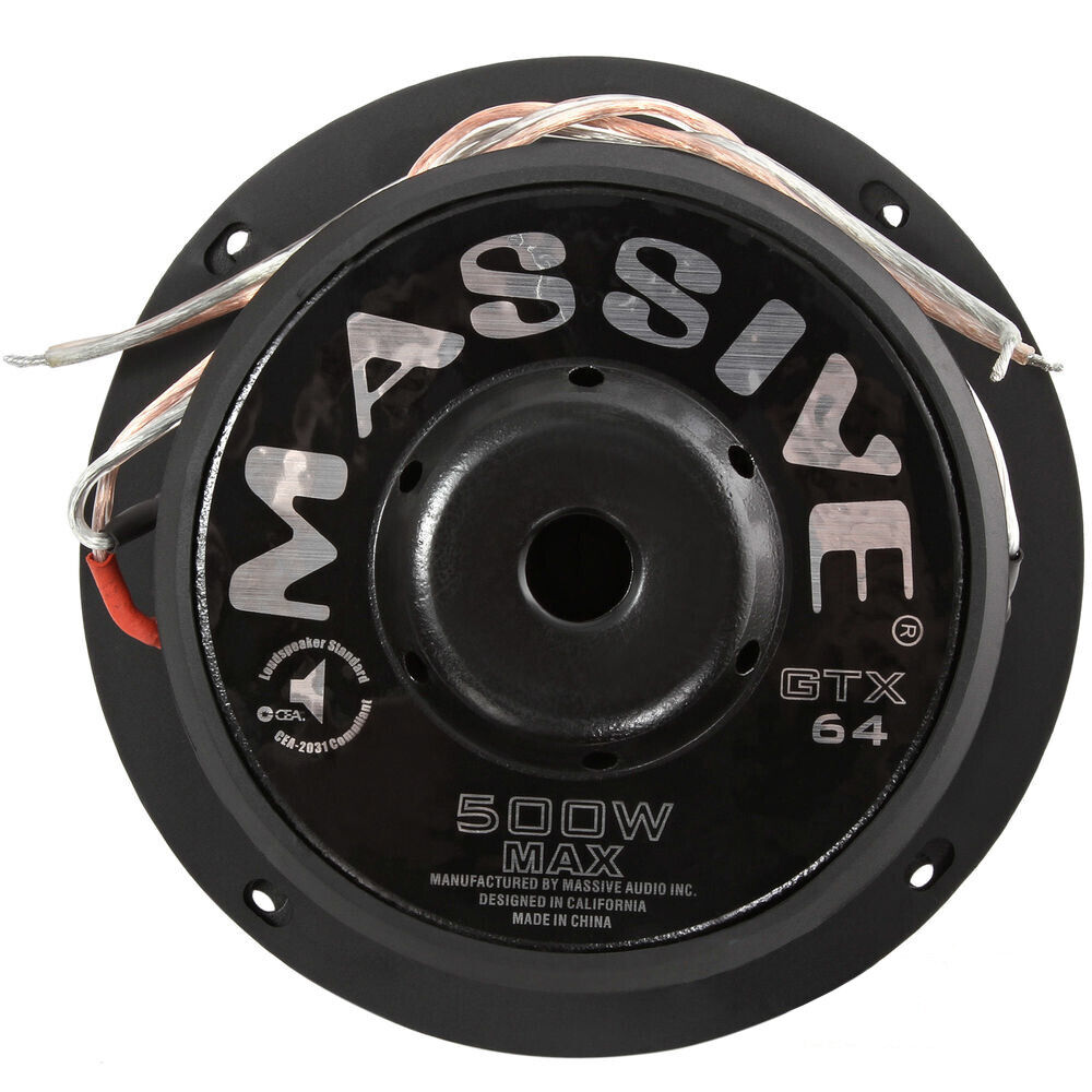 The GTX64 subwoofers are rated at 250 Watts RMS / 500 Watts MAX with a 1.5" Dual 4 Ohm voice coil configured. All GTX subs use tight Red stitching that's sewn through a UV-treated non-pressed paper cone onto an EROM foam surround. Then it's bonded to a heavy gauge steel basket that's bolted to double stacked high flux Y30 70oz Strontium ferrite magnets with a 10mm top plate. Then everything dances on a springy poly cotton spider with high powered woven tinsel leads that connect to spring-loaded 5-way binding nickel-plated speaker connectors. These woofers scream sound quality and truly represent Massive Audio's commitment to value and performance.