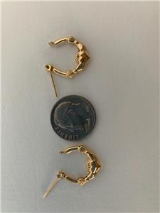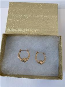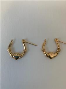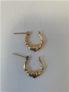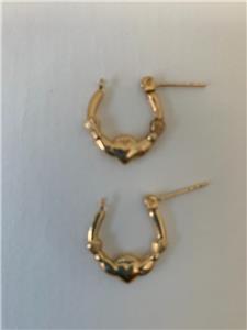 A pair of solid 14K yellow gold Claddagh earrings. These are small earrings. The diameter is only approximately .5 inches (14MM) in diameter. The lovely earrings are marked 14K and the maker is JCM.