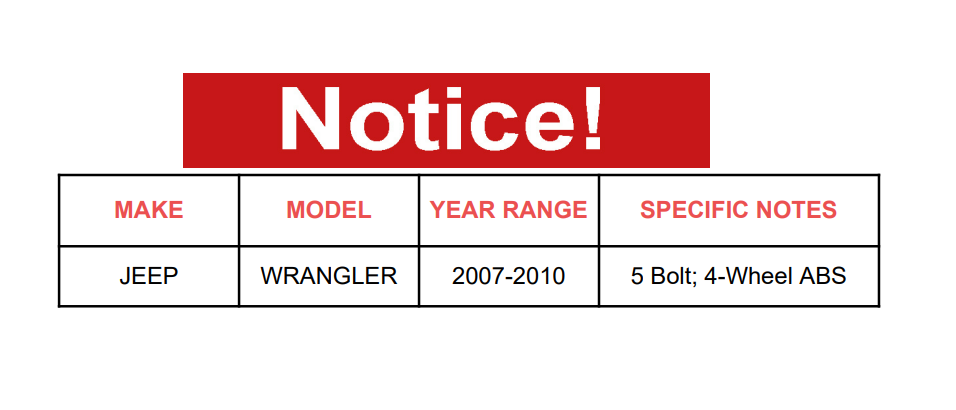 | JEEP | WRANGLER | 2007-2010 | 5 Bolt W/ ABS |