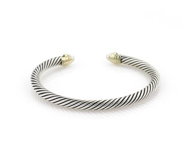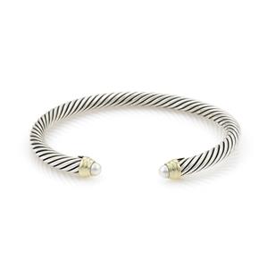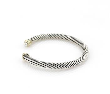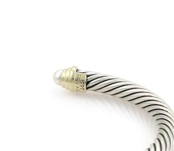 This elegant authentic cuff bracelet is by David Yurman, it is crafted from sterling silver with 14k yellow gold accent. The 5mm thick cable bangle is in a cuff style with yellow gold ribbed knobs and lustrous pearl mounted on each end. . It is signed by the designer with the metal content.