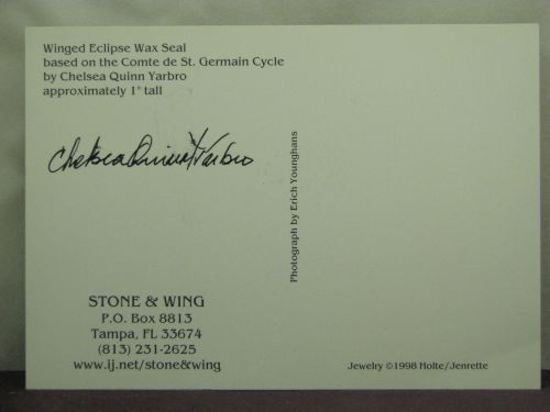Description: One promotional postcard published by Stone and Wing to celebrate Chelsea Quinn Yarbro's books about the Comte de St. Germain. Signed by author Chelsea Quinn Yarbro on the back without inscription or personalization.