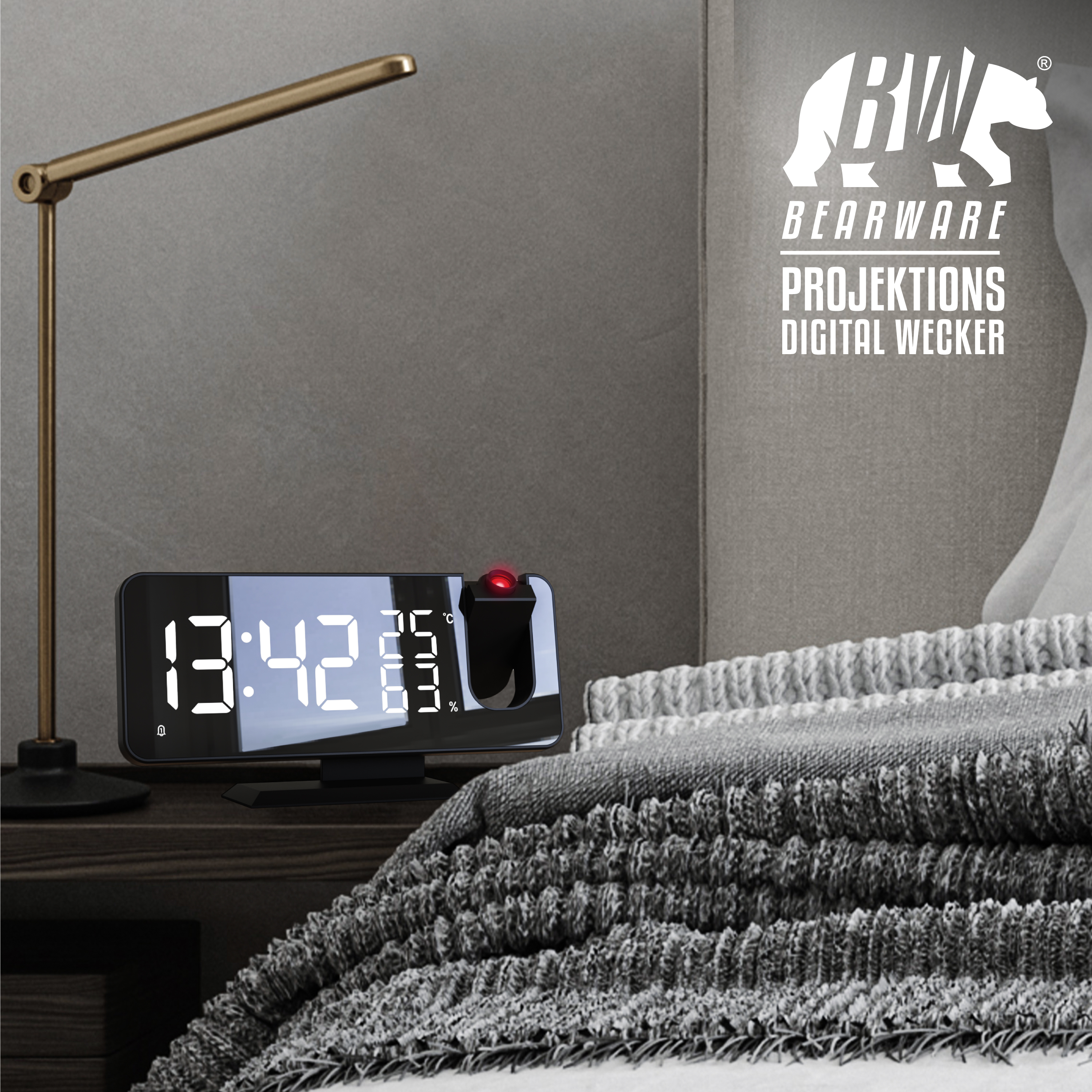 Ein Projektionswecker, der sich im täglichen Einsatz bewährt. Seine 7-Tasten -Bedienung geht einfach von der Hand. Ausgestattet mit 2 Alarmzeiten, FM Radiowecker mit 15 Speicherplätzen und präzise einstellbarer Lautstärke. Die Anzeige kann in großen Ziffern an die Wand projiziert werden, dafür stehen zwei Helligkeiten (sowie AUS) zur Verfügung. Zum Laden von Handys (mit 5V, 2A) befindet sich ein USB-Ladeport mit an Bord. Sogar Temperatur (0-50°C) und Luftfeuchtigkeit (20 – 95%) zeigt Ihnen das Gerät an.