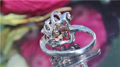 The ring features 11 hand cut G-J color, SI1-I1- clarity, natural not enhanced, bright white fiery single cut diamonds.