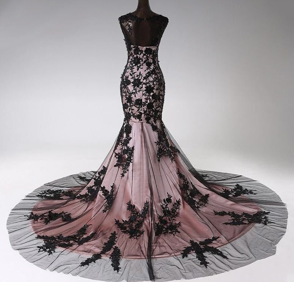 Gothic Black Pink Wedding Dresses Scoop Neck Lace Appliques Mermaid Bridal Gowns