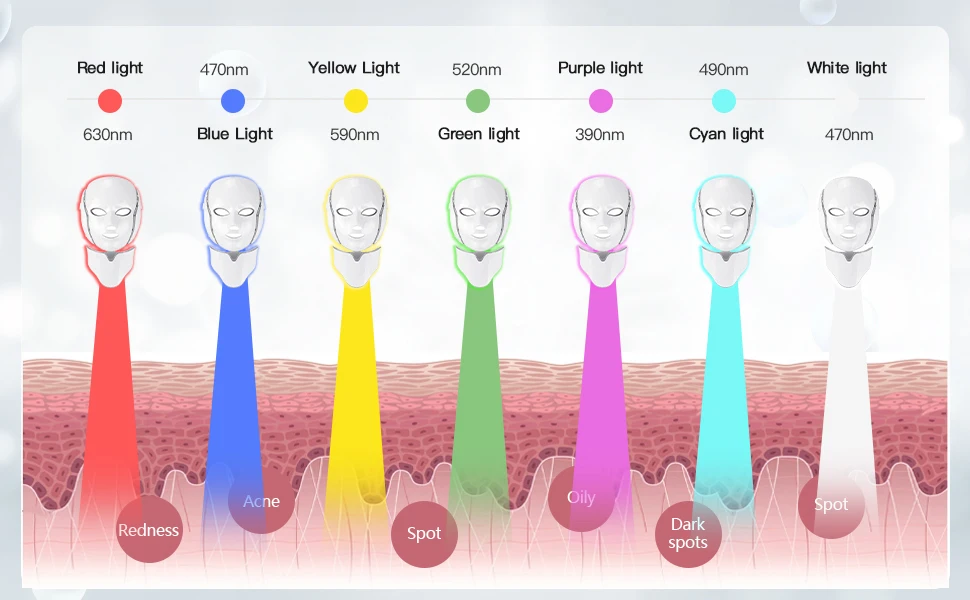 7 Colors Effect Red light 620-630nm It will stimulate the growth of collagen. Collagen is an essential protein that used to repair damaged tissues and to repair the old tissues. It can remove fine line and shrink pores.