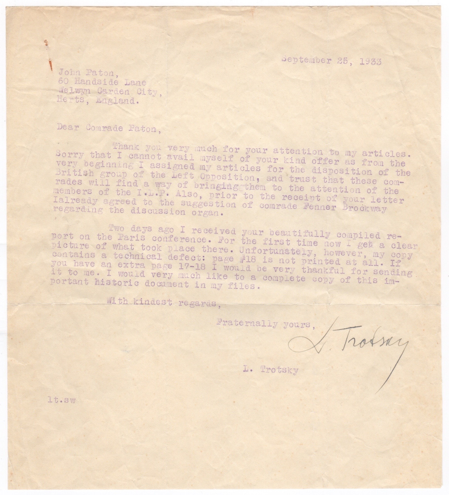 Typed letter signed “L. Trotsky”. 1p., 7.75 x 8.5 inch, n.p., 1933 September 25. To Comrade John Paton in Herts, England. In English, in full: “Thank you very much for your attention to my articles. Sorry that I cannot avail myself of your kind offer as from the very beginning I assigned my articles for the disposition of the British group of the Left Opposition, and trust that these comrades will find a way of bringing them to the attention of the members of the I.L.P. (Independent Labour Party). Also, prior to the receipt of your letter I already agreed to that suggestion of comrade Fenner Brockway regarding the discussion organ. Two days ago I received your beautifully compiled report on the Paris conference. For the first time now I get a clear picture of what took place there. Unfortunately, however, my copy contains a technical defect: page #18 is not printed at all. If you have an extra page 17-18 I would be very thankful for sending it to me. I would very much like to a complete copy of this important historic document in my files”. Some creases, handling wear, probably slightly trimmed, else good condition. The Paris conference referred to took place on 27-28 August 1933. It was held of the Left Socialists Communist Oppositional organisations with fourteen groupings represented on the grounds of degeneration of the Third International, (an international organisation founded in 1919 that advocated world communism), the Trotskyist sections declared for a Fourth International. This was founded by Trotsky and other communists in 1938 as an oppositional alternative to the Stalin-dominated Comintern. A fine historic letter!