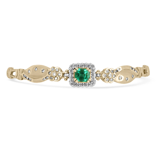 Indulge in a Colombian emerald and diamond gold tennis bracelet 1.70-carats. A vivacious, green emerald is prong-set in the center of this stunning bracelet. Minor flaws are absolutely normal in colored gemstones and add to their unique ambiance. Colombia is known to source the world's best emeralds and our emerald is no exception. Our hand made gold bracelet features diamonds set around the center gem and on the first link of the bracelet. The clasp is easy to use and very secure! This piece must be seen in person!
