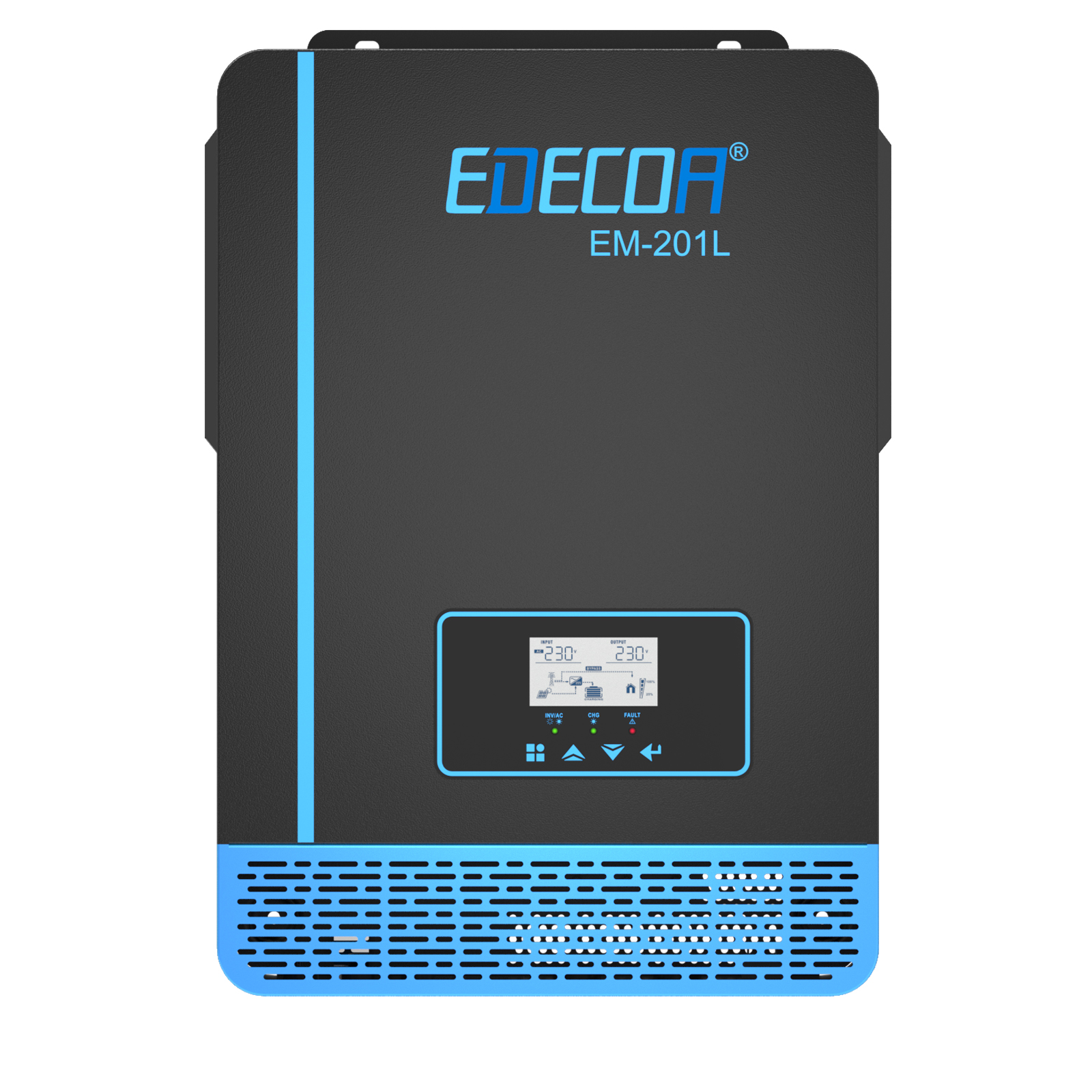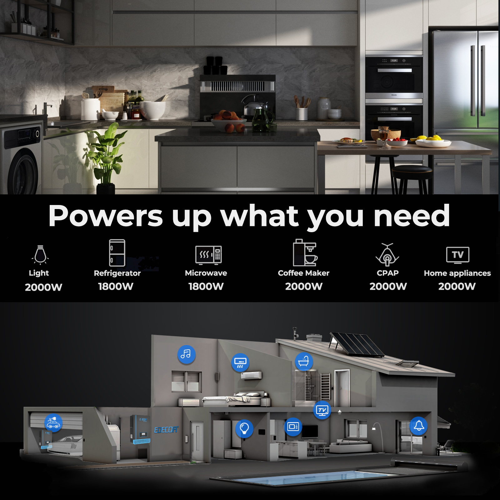 Der intelligente EDECOA Wechselrichter kann kontinuierlich 2000W Leistung liefern. Durch Anschließen des Wechselrichters an die Batterie kann er von 12V Gleichstrom auf 220V/230V Wechselstrom bei 50Hz umwandeln.