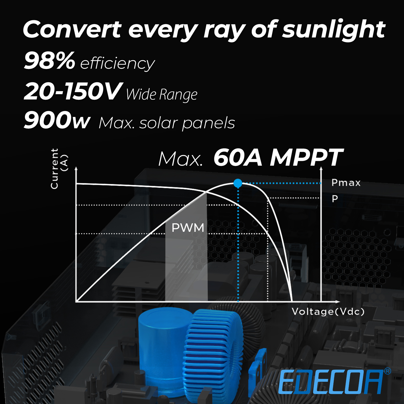 Hoher PV-MPPT-Ladestrom: Bis zu 60A mit einem PV-Eingangsspannungsbereich von 20-150VDC. Geeignet für die Installation und Nutzung in Wohnmobilen und begrenzten Räumen..