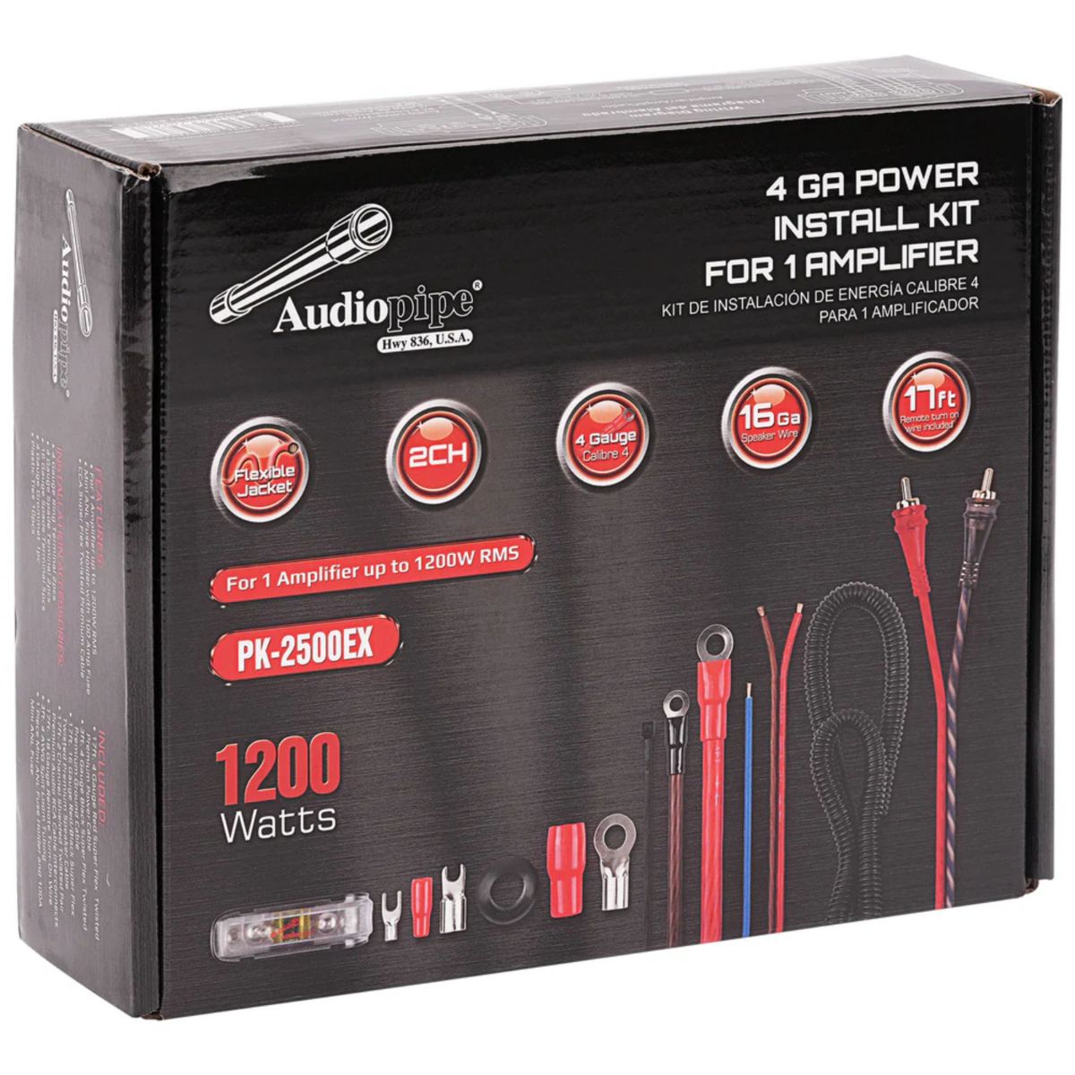 Power your system the right way. The Audiopipe PK-2500EX 4 Gauge Install Kit is engineered for single amplifiers up to 1200 Watts RMS, delivering dependable power transfer, clean signal flow, and organized installation in one complete package. Built with Super Flex twisted CCA wiring and quality connection hardware, this kit ensures efficient current delivery and easy routing in tight vehicle spaces.