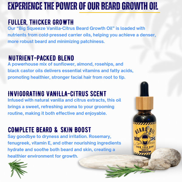 Don't let patchy spots slow you down! Grow your mane to its fullest potential with our finely crafted beard growth oil. Our “Big Squeeze Vanilla-Citrus Beard Growth Oil” is a specialized powerhouse blend of the finest cold pressed carrier oils and 100% pure essential oils packed with nutrients designed to promote a fuller, thicker, healthier beard. Infuséd with the delicious scents of vanilla and citrus, making your beard care routine a treat.