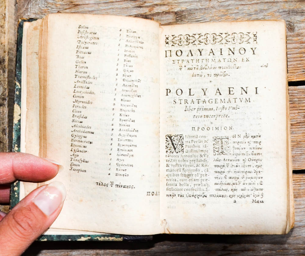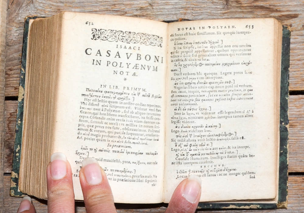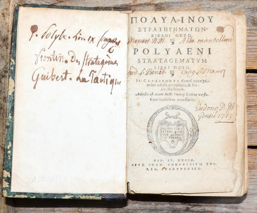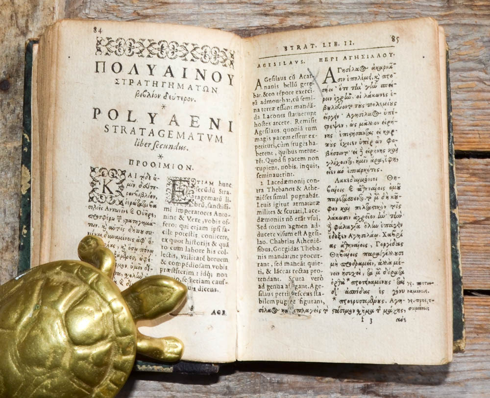 - Editio princeps des griechischen Originals, besorgt von dem Genfer Humanisten Isaac Casaubon (1559-1614). Die lateinische Übertragung des Justus Vulteius war bereits 1549 in Basel erschienen, 1551 und 1552 folgten zwei verschiedene italienische Übersetzungen in Venedig. Die älteren Bibliographen geben noch Lyon, die Heimatstadt de Tournes’ als Druckort an (Jähns sogar Leiden), Erscheinungsort ist jedoch Genf. - "Der … Stoff verdient … einige Aufmerksamkeit, weil ein Teil der Originalwerke, aus denen Polyaen schöpfte, ein Raub der Zeit geworden ist" (Jähns).