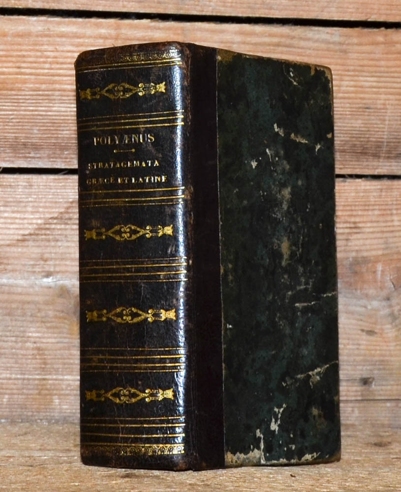 Polyaenus. Strategematon bibloi okto (graece). Stratagematum libri octo. Is. Casaubonus graece nunc primum edidit, emendavit, & notis illustravit. Adiecta est etiam Iusti Vulteii latina versio. Genf, Jean (II) de Tournes (Tornaesius), 1589. Circa 12,8 x 8, 5 cm. 8 Bll., 754 SS., 15 Bll., mit 2 verschiedenen Druckermarken Halbleder um 1900 mit reicher Rückenvergoldung.