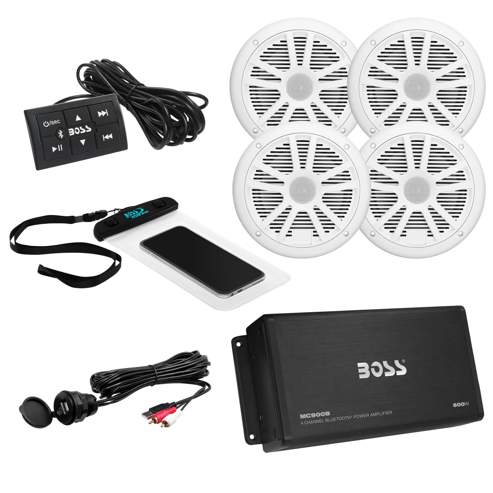 This kit packs a punch with the MC900B 4-Channel amplifier w/multi-function controller, a two (2) pairs of 6.5" MR6W speakers, waterproof pouch and a USB/Aux accessory extension cable.