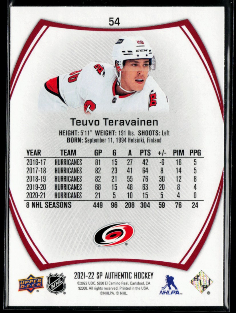 | Description: | Teuvo Teravainen | | Category: | Hockey | | Year: | 2021 | | Product: | SP Authentic Limited Red | | Team: | Carolina Hurricanes | | Card Number: | 54 | | Dimensions: | 3½" x 2½" | | SKU: | HK A0038 R02 D (16) |
