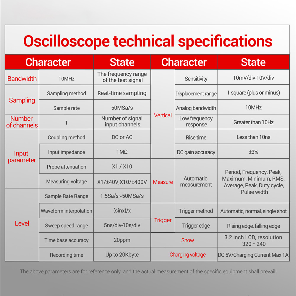 Oscilloscope basic parameters: Bandwidth: 10MHz Sampling mode: real-time sampling Sampling rate: 50MSa/s Number of channels: single channel Coupling mode: DC or AC Input impedance: 1MΩ Probe attenuation: X1/X10 Measuring voltage: X1/±40V,X10/±400V Sampling rate range: 1.5Sa/s~50MSa/s Waveform interpolation: (sinx)/x Sweep rate range: 5ns/div-10s/div Time base accuracy: 20ppm Recording duration: up to 20Kbyte Sensitivity: 10mV/div-10V/div Displacement range: 1 frame (positive and negative) Analog bandwidth: 10MHZ Low frequency response: greater than 10HZ Rise time: less than 10ns DC gain accuracy: ±3% Automatic Measurement: Period, Frequency, Peak Maximum, Minimum, RMS, Average, Peak, Duty Cycle, Pulse Width Trigger mode: automatic, normal, single Trigger edge: rising edge, falling edge Display: 3.2-inch LCD resolution 320 * 240 Charging voltage: DC 5V / charging current maximum 1A