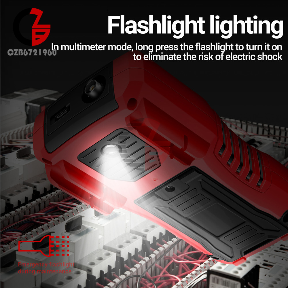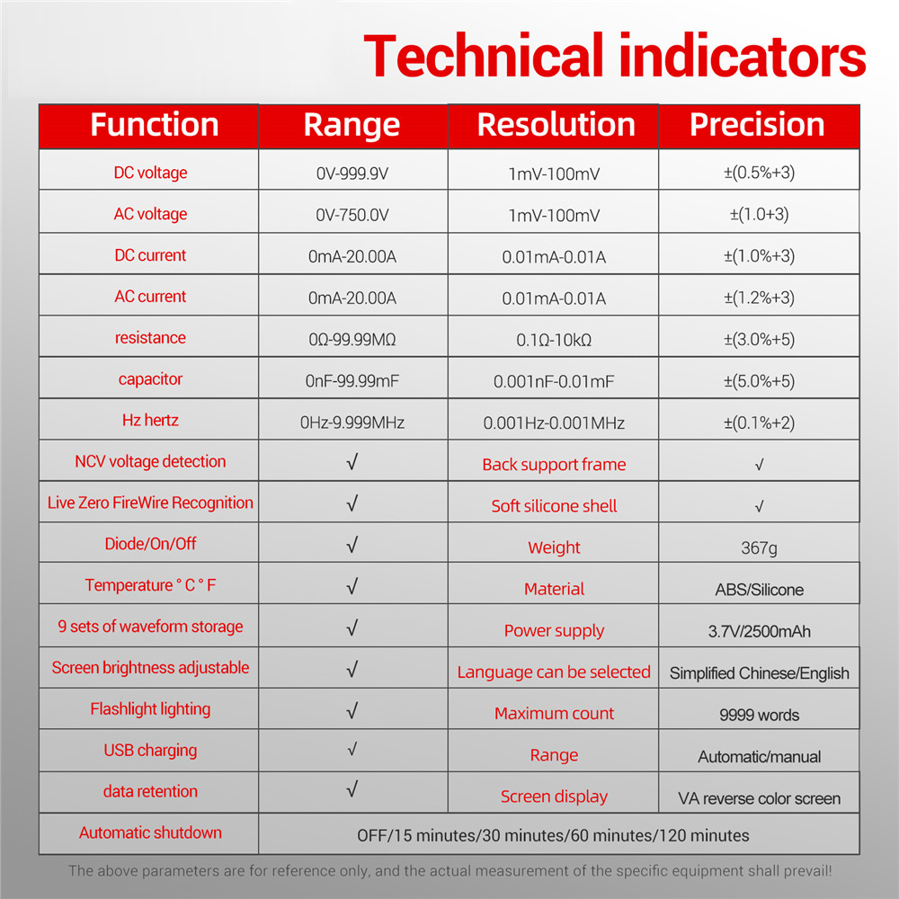 Multimeter parameters: DC voltage: 0V-999.9V, resolution 1mV-100mV, accuracy ± (0.5%+3) AC voltage: 0V-750.0V, resolution 1mV-100mV, accuracy ± (1.0+3) DC current: 0mA-20.00A, resolution 1mV-100mV, accuracy ±(1.0+3) AC Current: 0mA-20.00A, resolution 1mV-100mV, accuracy ±(1.2%+3) Resistance: 0Ω-99.99MΩ, resolution 0.1Ω-10kΩ, accuracy ±(3.0%+5) Capacitance: 0nF-99.99mF, resolution 0.001nF-0.01mF, accuracy ±(5.0+5) Hz Hertz: 0Hz-9.999MHz, resolution 0.001HZ-0.001MHZ, accuracy ±(0.1+2) NCV voltage detection: √ Live zero fire wire recognition: √ Diode/On/Off: √ Temperature ℃/℉: √ 9 sets of waveform storage: √ Screen Brightness Adjustable: √ Flashlight illumination: √ USB charging: √ Data hold: √ Auto power off: √ Back support stand: √ Soft silicone shell: √ Material: ABS/Silicone Power supply: 3.7V/2500mAh Language selectable: Simplified Chinese/English Maximum count: 9999 counts Range: Auto/Manual Screen display: VA reverse color display