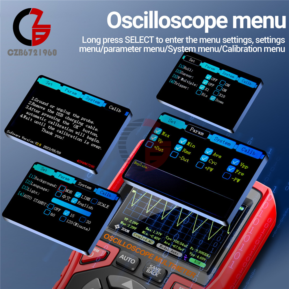 Features: 1.Multi-parameter intelligent detection: oscilloscope + multimeter dual function, covering voltage / current / frequency / temperature and other 20 + parameters, a machine to meet the needs of electronic maintenance and teaching. 2. High-precision real-time sampling: Oscilloscope 50MSa/s real-time sampling, ± 0.5% DC accuracy, accurately capture millisecond signal fluctuations, details are not missed. 3. Portable and durable design: 3.2-inch color screen + soft silicone drop-proof case, 2500mAh battery life + Type-C fast charging, lightweight and reliable outdoor work. 4.Intelligent auxiliary functions: NCV non-contact power measurement/automatic waveform storage/data retention, with sound and light double prompts, novice can also quickly troubleshooting. 5. Multi-scenario compatibility: oscilloscope 10MHz bandwidth + multimeter 9999 word range, from home appliance repair to laboratory measurements, all-around fit.