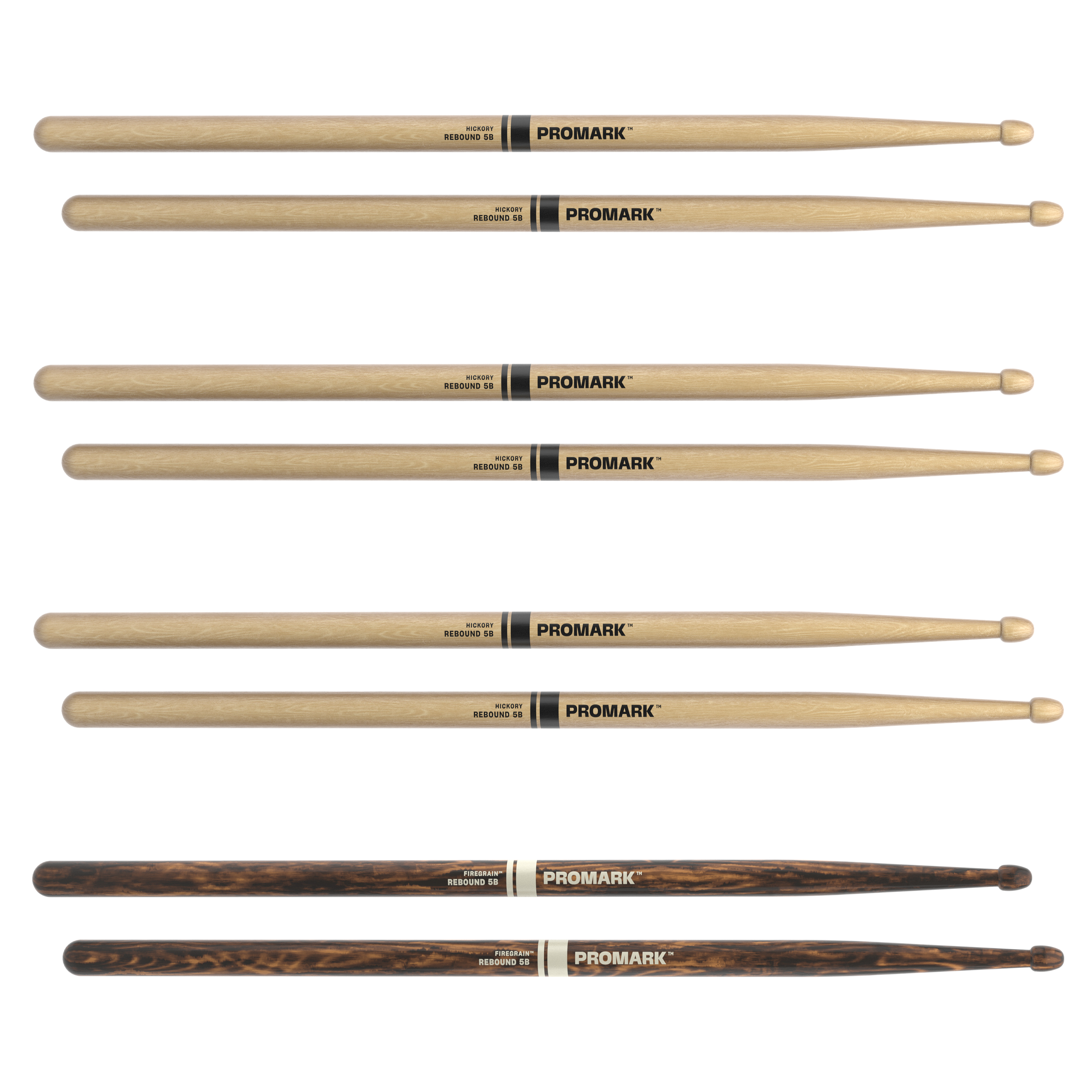 ProMark Bonus Packs deliver quality, reliability, and innovation-all at an incredible value. This 4-pack includes three pairs of our trusted standard Rebound 5B hickory sticks, plus one bonus pair of Rebound 5B FireGrain. Rebound 5B drumsticks feature an acorn tip and long taper, producing a rear-weighted feel that increases agility. With the addition of our exclusive FireGrain treatment, the bonus pair lets you hit harder and play longer, while maintaining the stick's original weight and balance. Diameter : .595" / 15.1mm / Length: 16" / 406.4mm. ProMark Rebound drumsticks feature a rear-weighted design for increased force out of the playing surface. Available in various diameters, lengths, finishes, and wood types including FireGrain and ActiveGrip.
