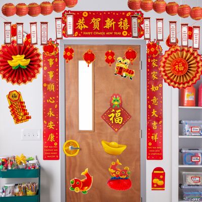 This Lunar New Year classroom decorating kit is the perfect way to bring the festive spirit of the Lunar New Year into any educational setting! Featuring vibrant decorations like lanterns, banners, and traditional symbols, this kit helps create an engaging and culturally rich atmosphere for students. Ideal for classrooms, school events, or community celebrations, the kit offers everything needed to transform a space into a vibrant Lunar New Year celebration. Easy to assemble and full of color, this decorating kit helps educate students while celebrating an important cultural holiday. Simple assembly required. (30 pcs. per unit) © OTCbr br Includes: br • 12 Paper Lunar New Year Riddle Hanging Paper Lanterns (4 1/2" x 13 1/2")br • 8-Pc. Cardstock Chinese New Year Spring Couplets Door Border Decorating Set (Assembled, 50" x 61 3/4")br • 10-Pc. Cardstock Lunar New Year Tabletop, Wall & Ceiling Decorating Kit (Includes one 7 ft. x 8" garland, six 4" - 8" x 3 3/4" - 8" cardstock cutouts, two 12" diam. hanging honeycomb tissue fans and one 9" cardstock centerpieces.)br br • Assortments are subject to change at any time and may vary from picture shown. Substituted items will be similar in nature.