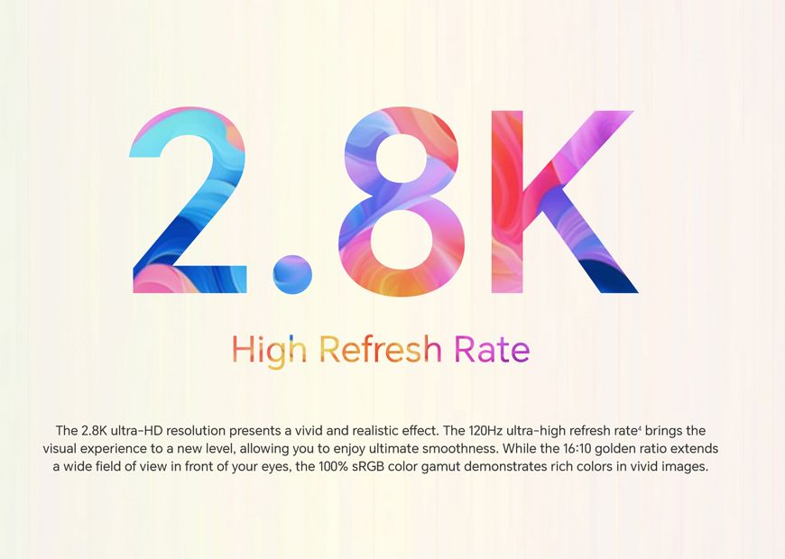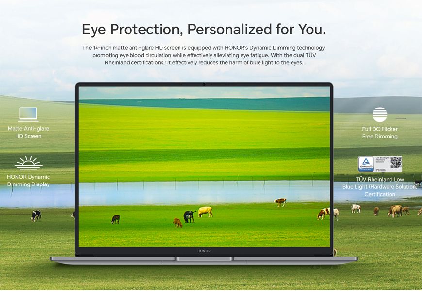 | Display | 14.0" IPS matte screen 2880*1800(243 PPI); Colour gamut 100% sRGB 88% screen-to-body ratio*, 16:10 display ratio, 178° wide viewing angle, 430nits brightness TÜV Rheinland Low Blue Light (Hardware Solution) Certification, TÜV Rheinland Flicker Free Certification |