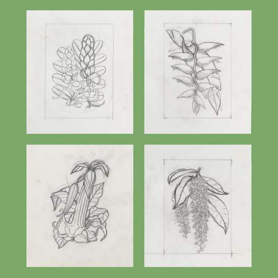 Pencil sketches by Sylvia Goaman, on individual pieces of translucent paper each measuring circa 156 x 180 mm, of preliminary designs for the Flowers commemorative set issued 31 July 1972. Wonderful assembly of early essays. Generally fine. SG344var-347var; SC337var-340var
